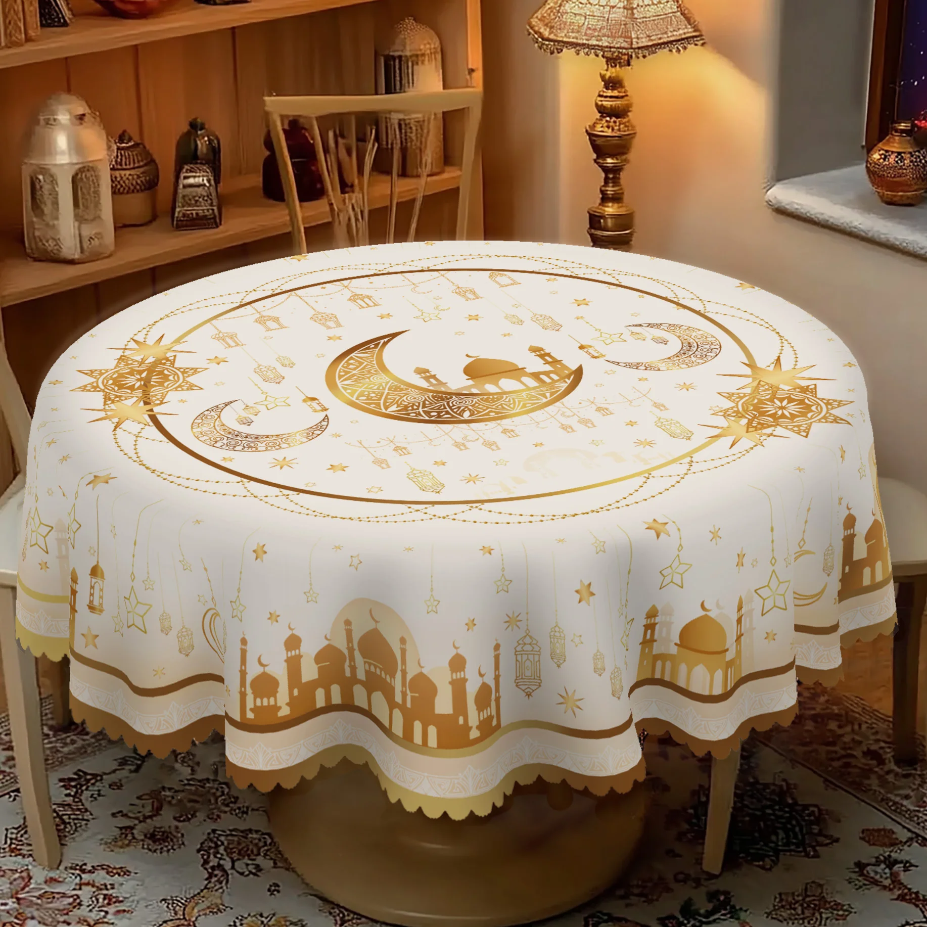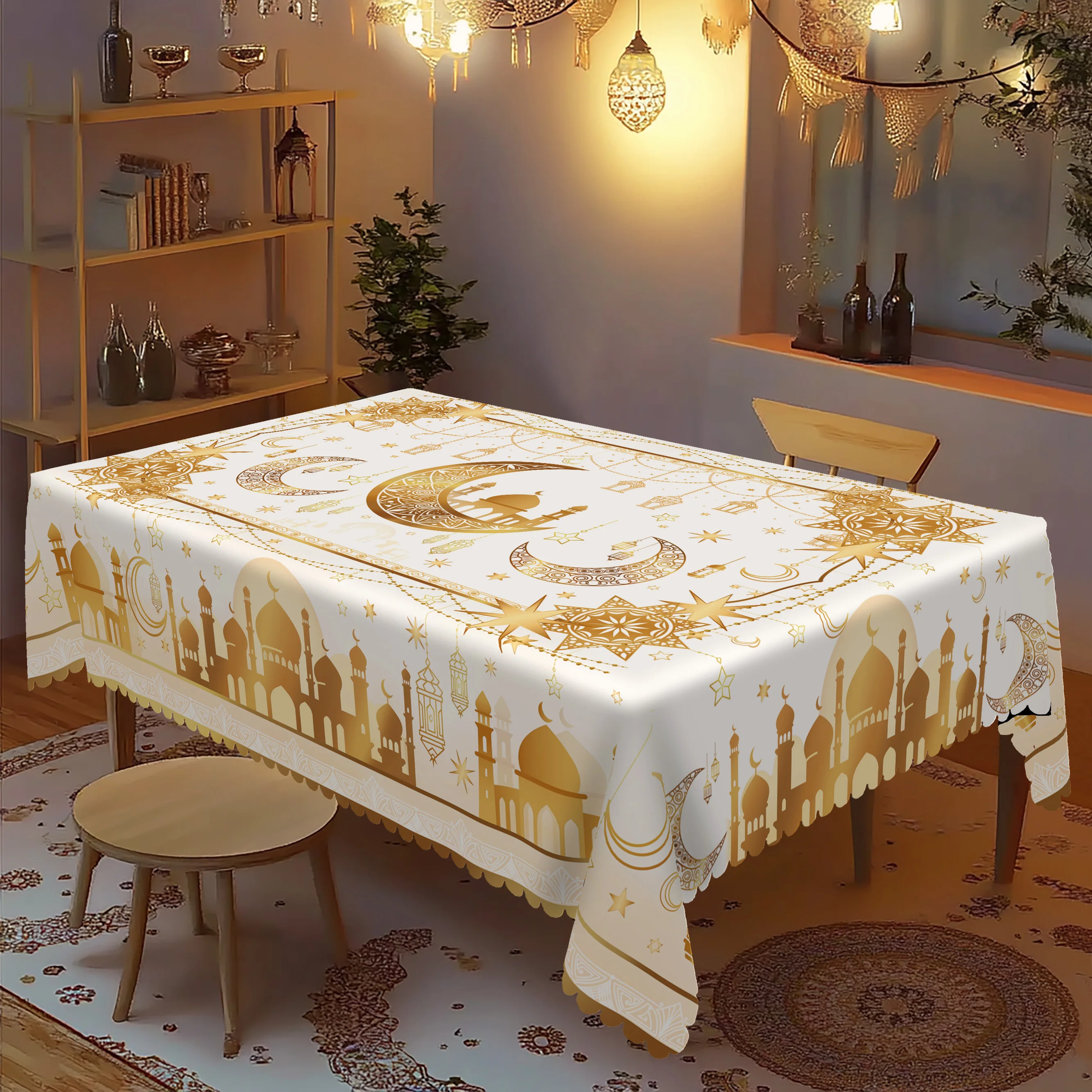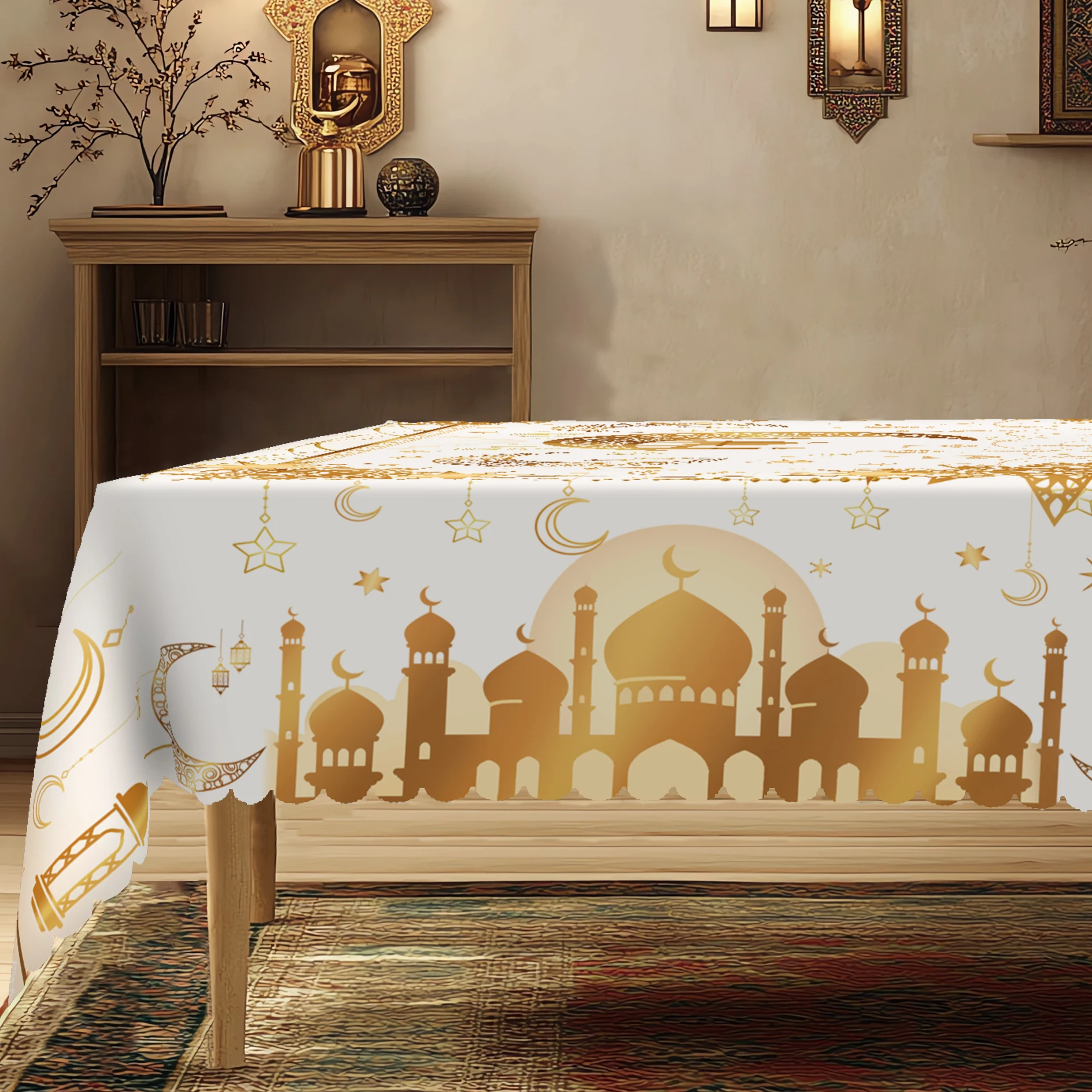 1 peça, toalha de mesa de poliéster banhada a ouro com tema de ramadã + 4 adesivos autoadesivos, arte islâmica clássica, padrão de impressão de lua e estrela, adequado para casa, mesa de jantar, varanda
