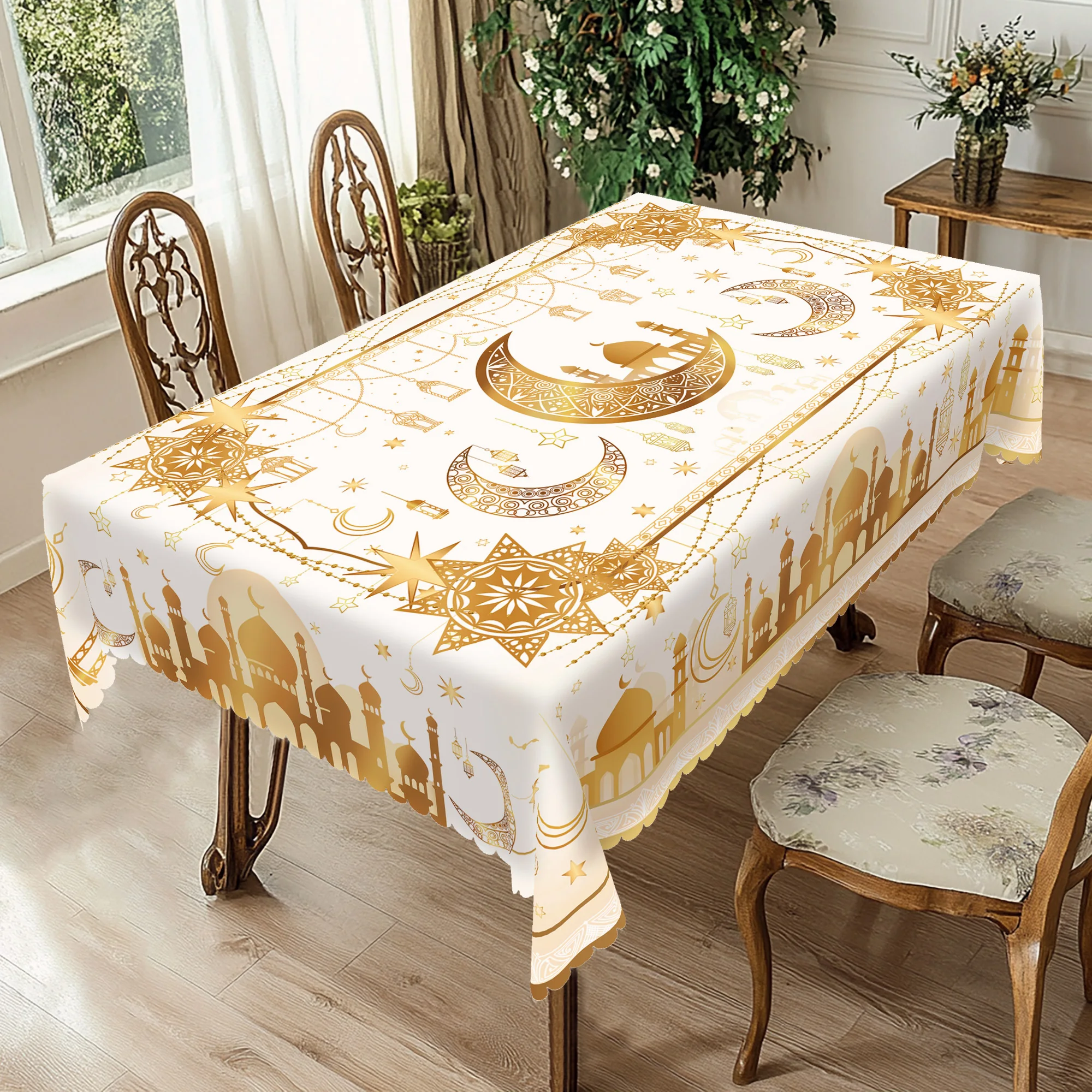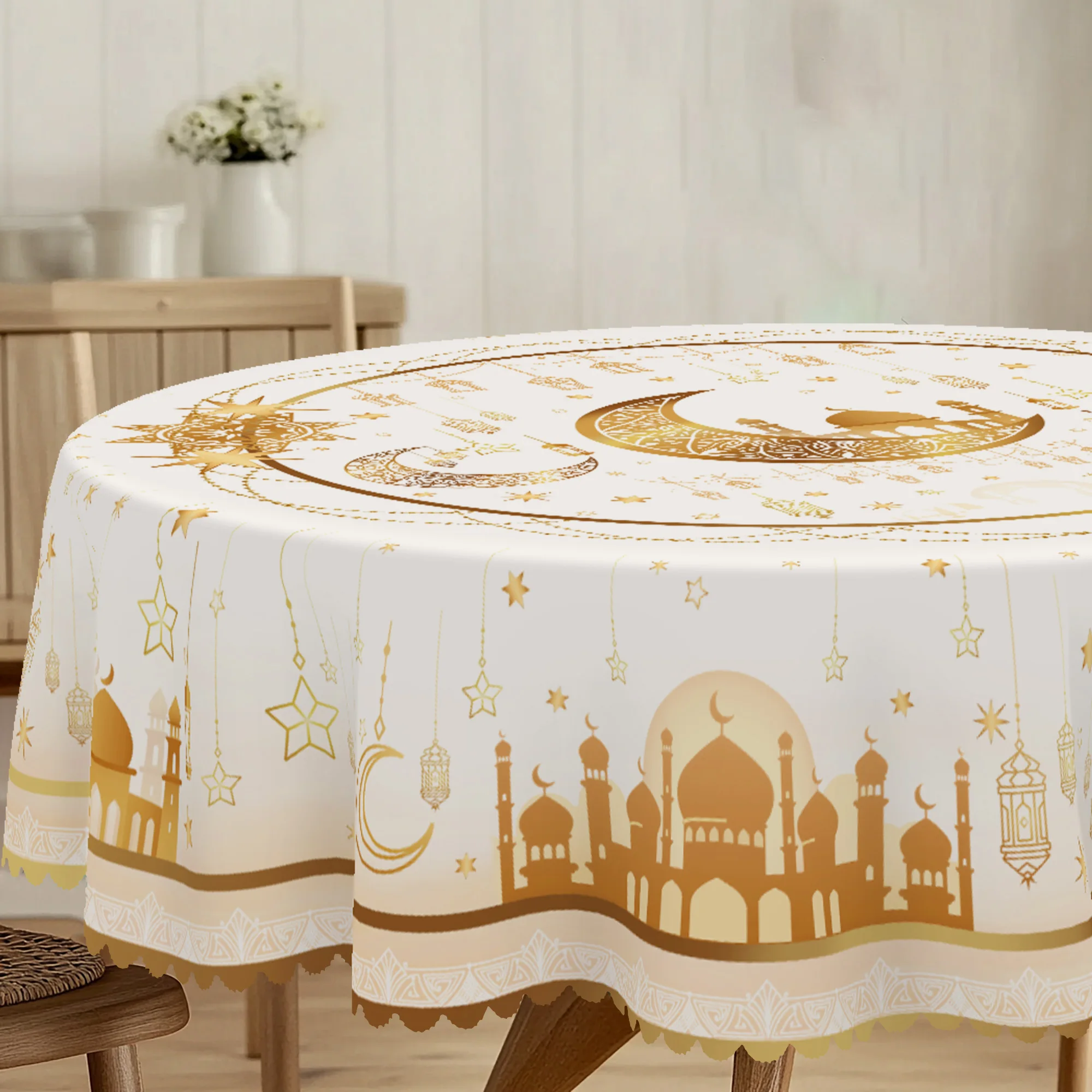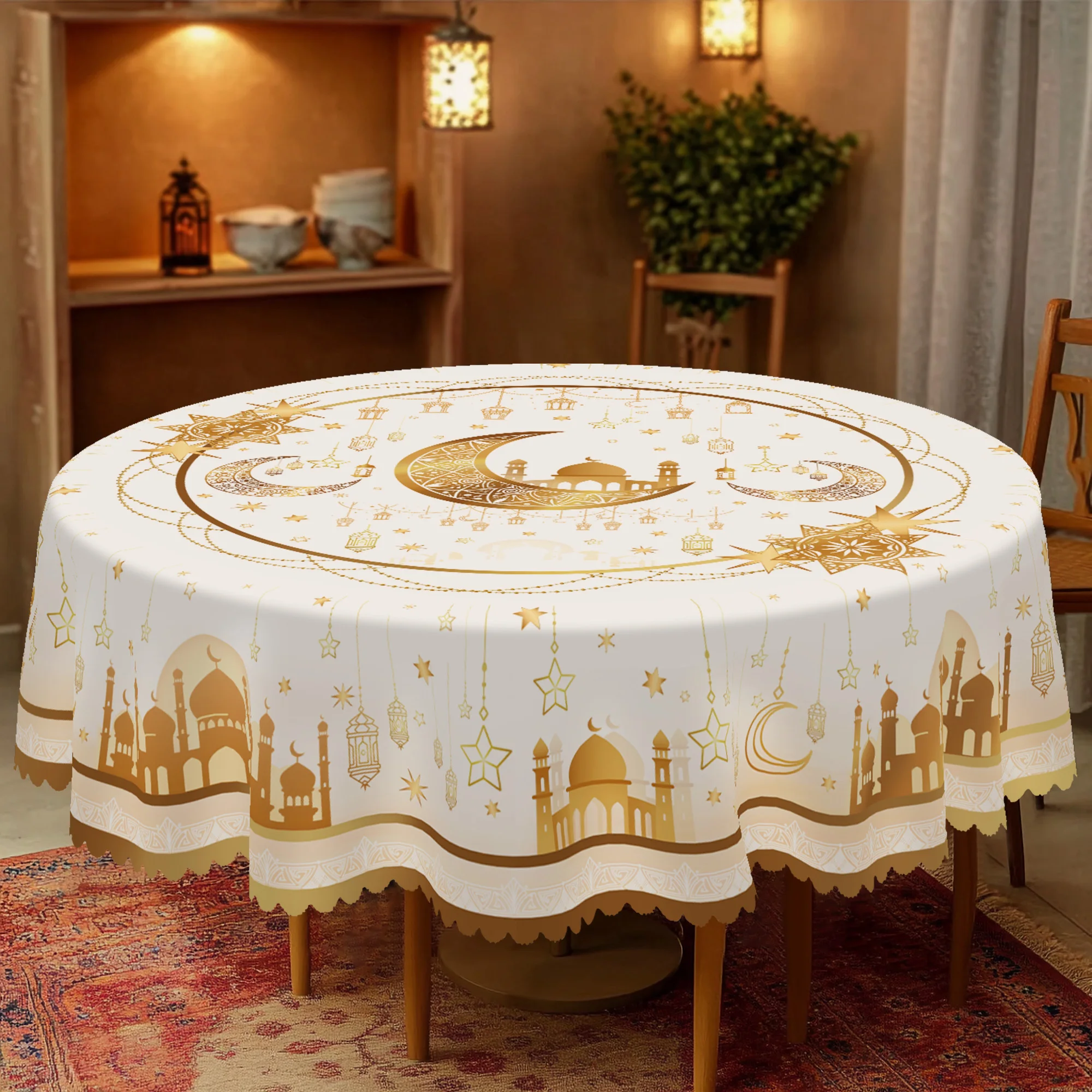 1 peça, toalha de mesa de poliéster banhada a ouro com tema de ramadã + 4 adesivos autoadesivos, arte islâmica clássica, padrão de impressão de lua e estrela, adequado para casa, mesa de jantar, varanda