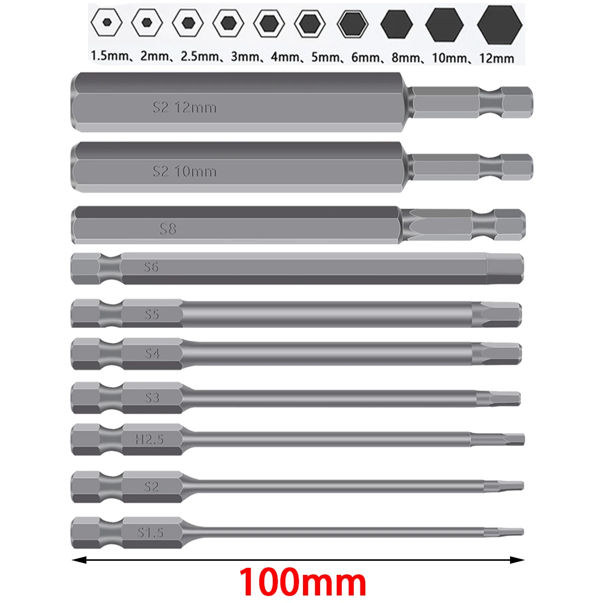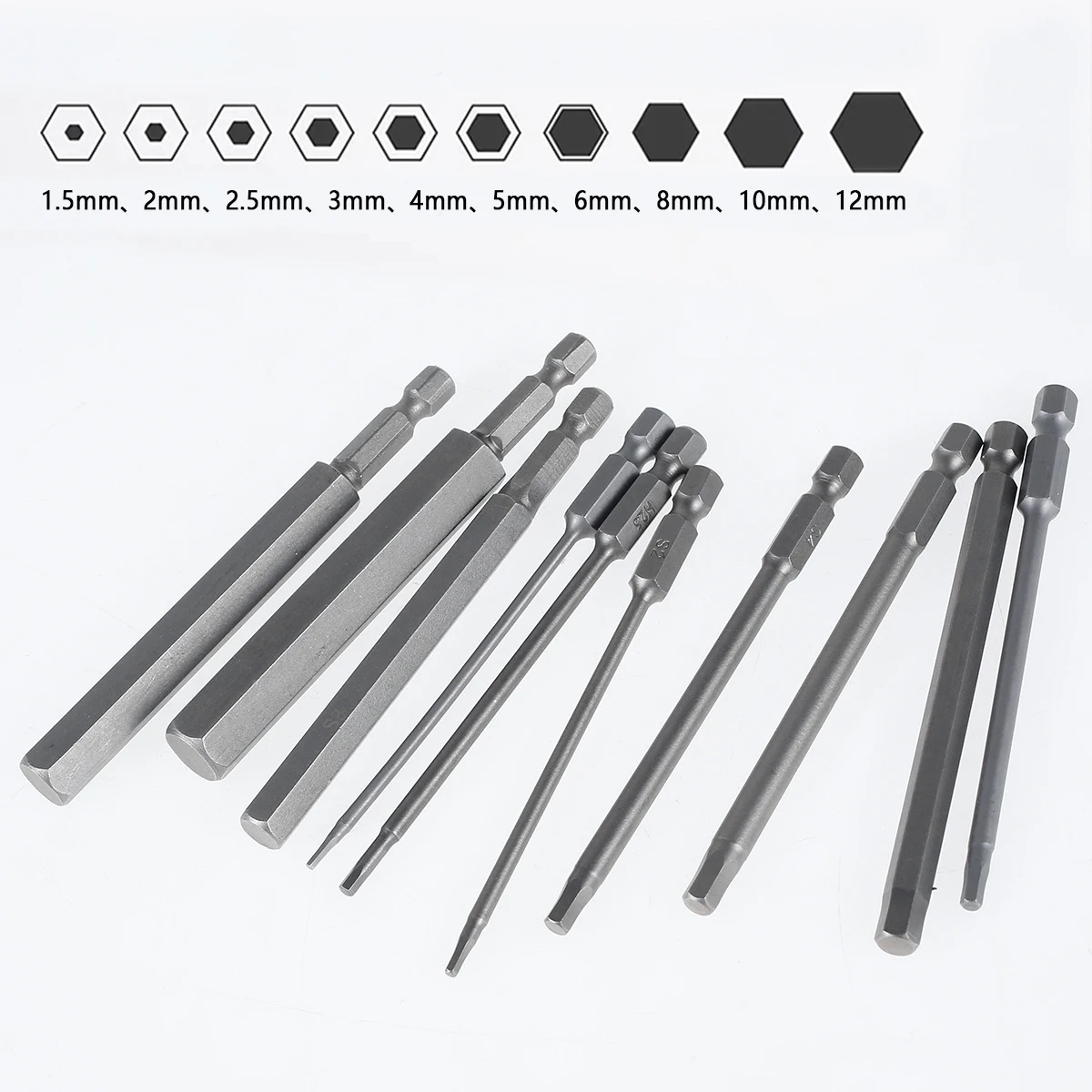 [Tamanho e pacote] O pacote inclui 10 peças de bits hexagonais com tamanhos diferentes, incluindo 1,5/2/2,5/3/4/5/6/8/10/12 mm.Vários tamanhos e quantidade suficiente podem atender às suas diferentes necessidades de trabalho, amplamente utilizados para reparo de ferramentas domésticas.