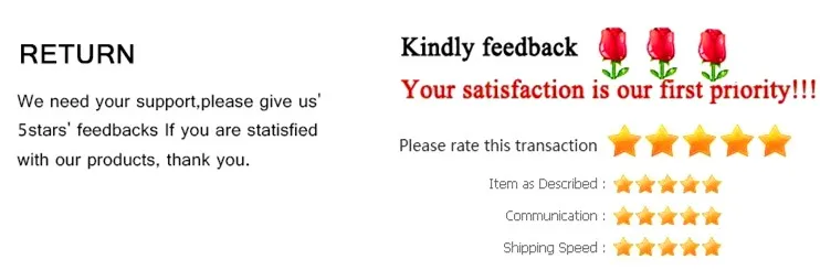 Trabalharemos com você até que você esteja satisfeito. esperamos sinceramente que você possa nos deixar um feedback positivo, por qualquer motivo, você não estiver satisfeito com sua compra, entre em contato conosco através de (Minhas Mensagens) ou (Faça perguntas ao vendedor), gerente comercial, antes de deixar um feedback neutro ou negativo. Faremos o nosso melhor para resolver qualquer problema e satisfazer suas necessidades.