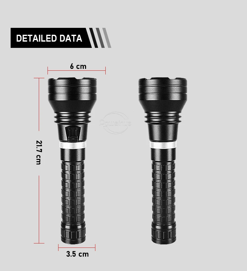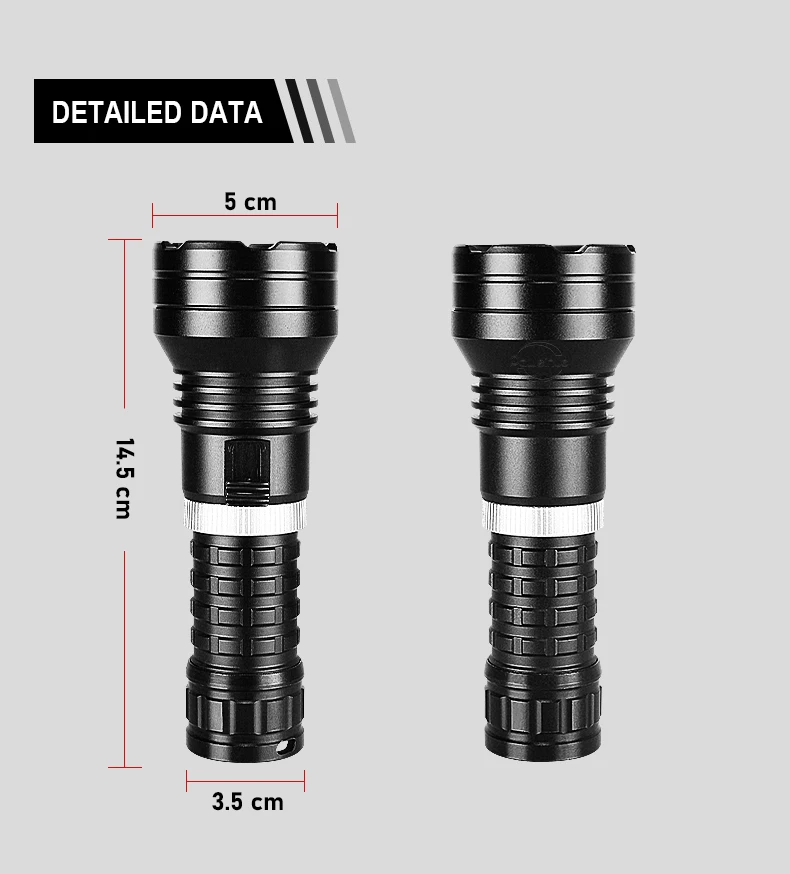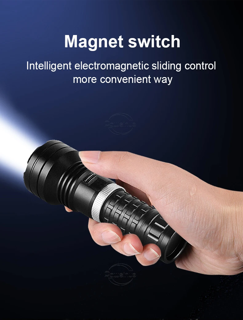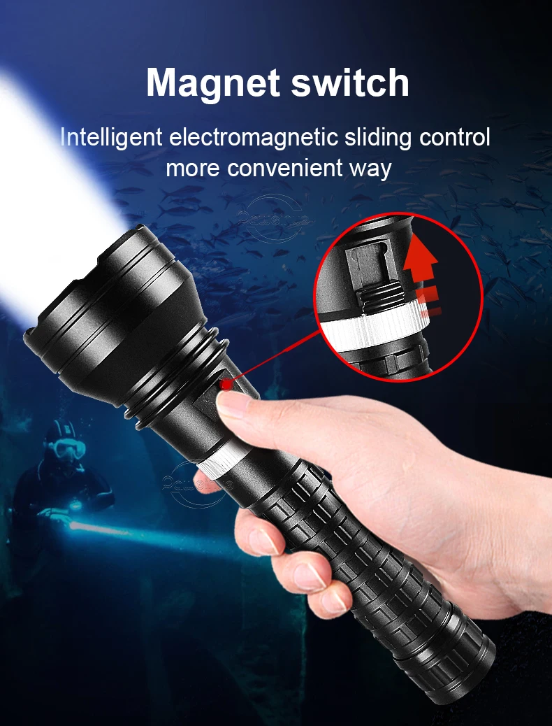 Esta é a nossa mais recente lanterna de mergulho XHP360.Este produto possui apenas 1 modo de iluminação, não há necessidade de pressionar botões repetidamente.O interruptor foi projetado com base no princípio de indução magnética do tipo arrasto, então você não precisa se preocupar com a entrada de água durante o uso, para que possa aproveitar seu tempo de mergulho com tranquilidade.
