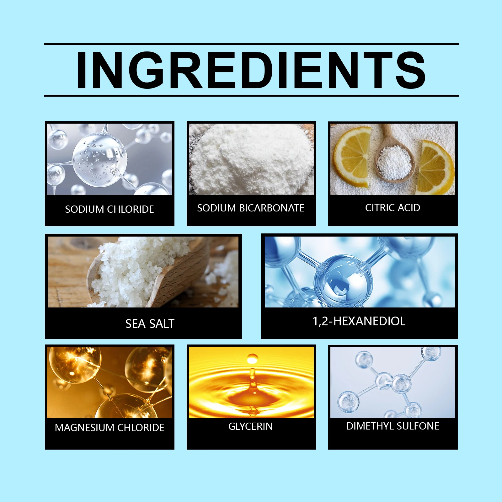 Feito com minerais adequados para a pele, como bicarbonato de sódio, para suavizar a pele, equilibrar o pH e deixá-la macia e renovada.
