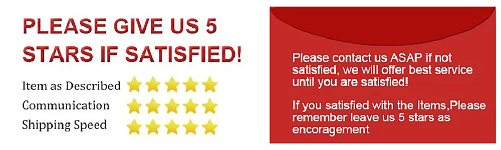 1.Deixe um comentário de 5 estrelas se estiver satisfeito com nossos produtos e serviços, nós agradeceremos (item conforme descrito 5 estrelas, comunicação 5 estrelas, tempo de envio 5 estrelas).