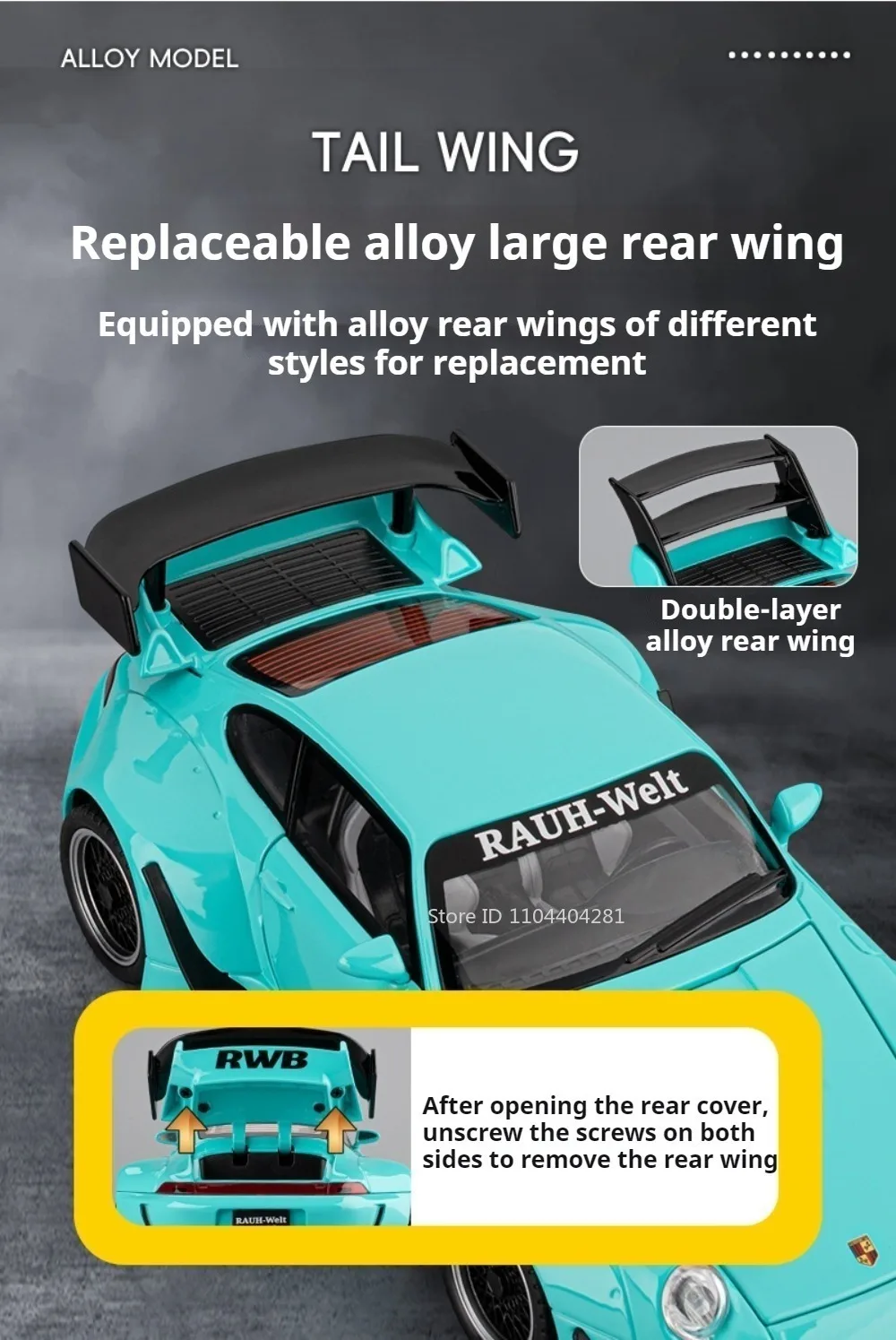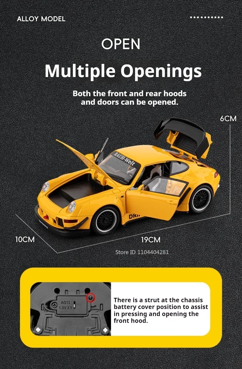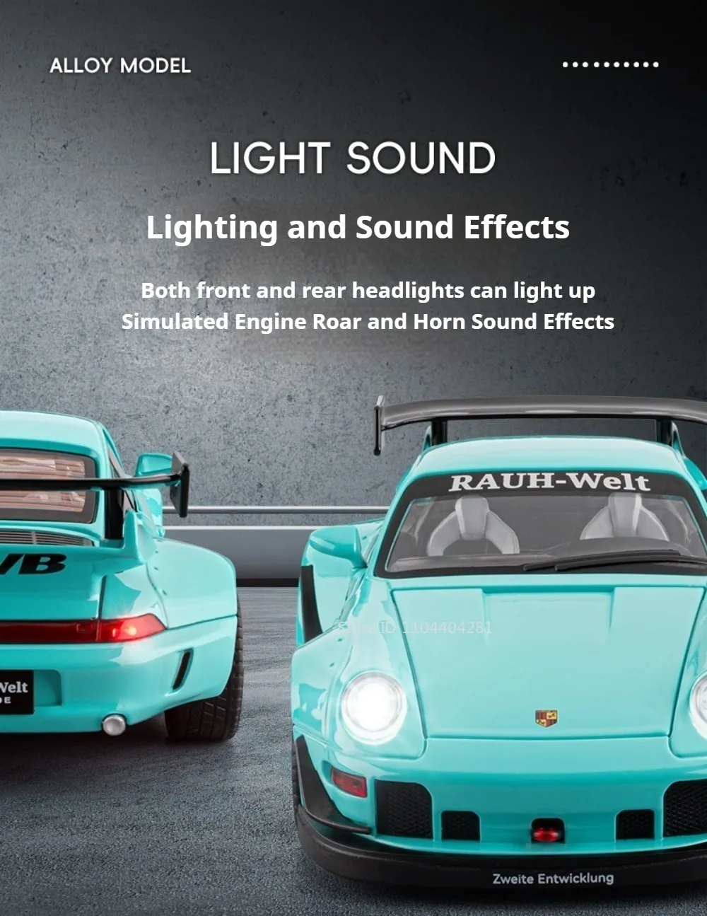 - > 1:22 rwb 993 na1 modelos de carros esportivos em miniatura, brinquedos de liga fundida, portas abertas, luz de som, puxar para trás, veículos, ornamentos colecionáveis