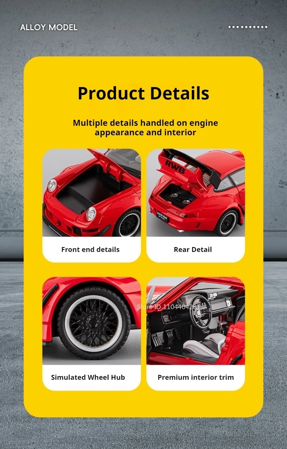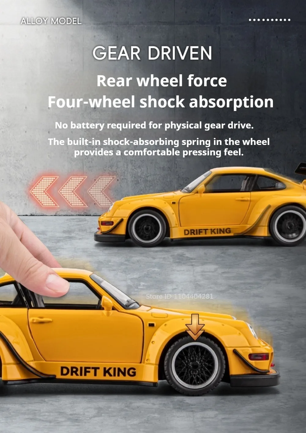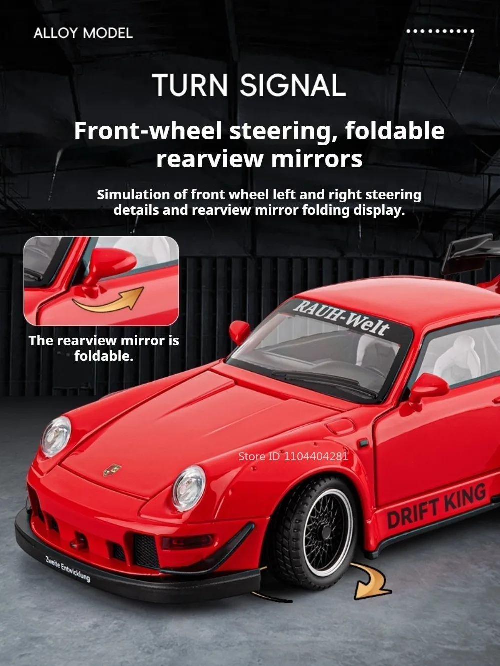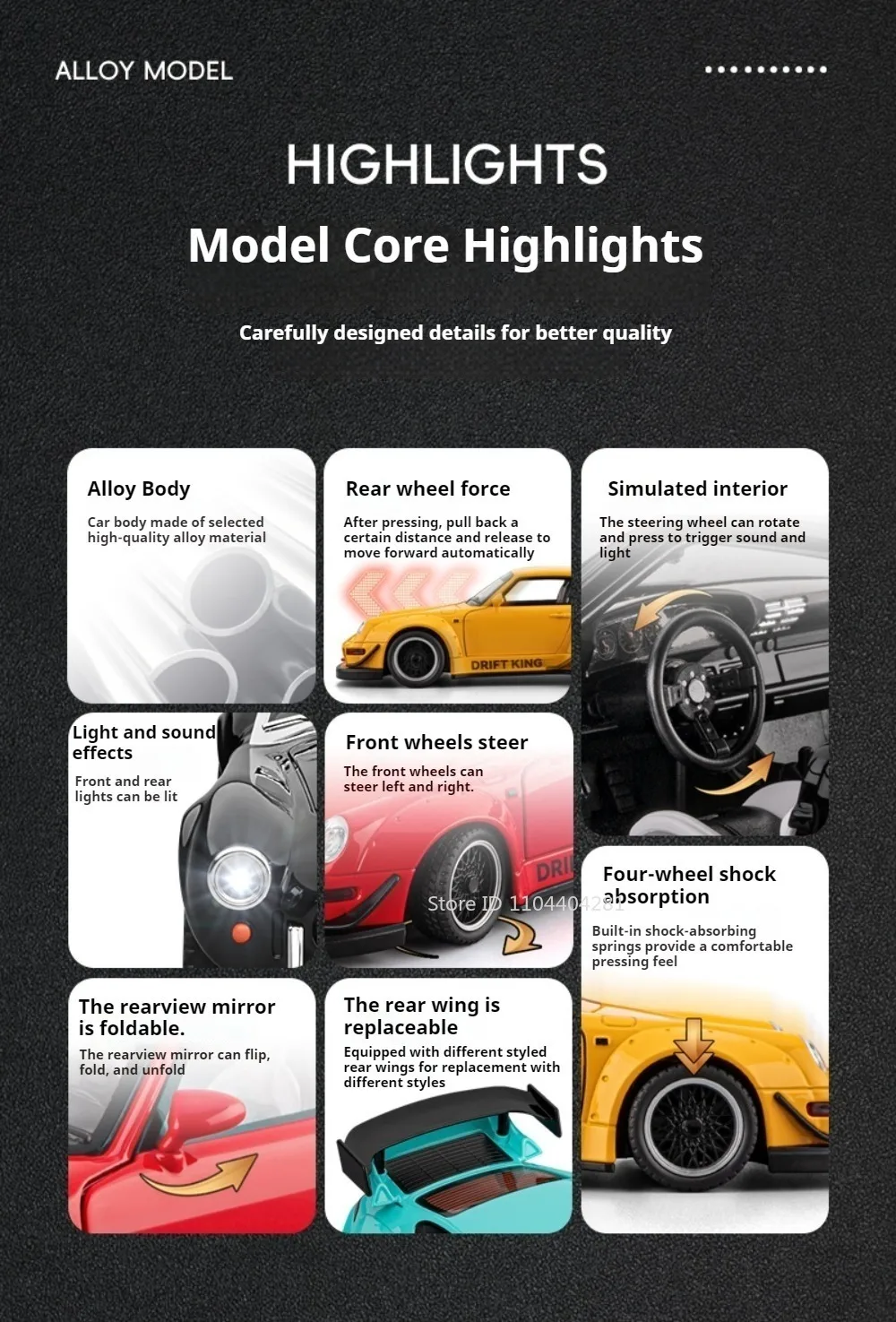- > 1:22 rwb 993 na1 modelos de carros esportivos em miniatura, brinquedos de liga fundida, portas abertas, luz de som, puxar para trás, veículos, ornamentos colecionáveis