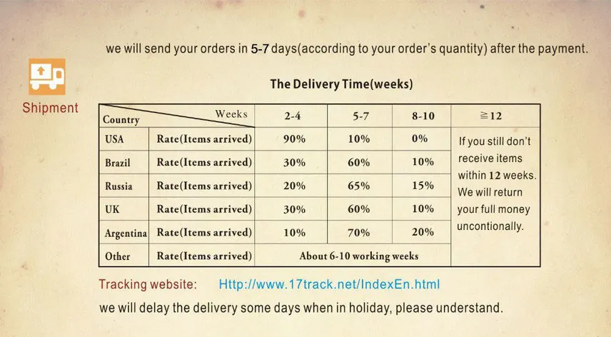 -Normalmente, o tempo de envio levará cerca de 7 a 30 dias úteis.Depende do destino e de outros fatores, se você não receber sua encomenda dentro de um mês, entre em contato conosco imediatamente.Nosso preço não inclui quaisquer impostos de importação e você é responsável pelas taxas alfandegárias.