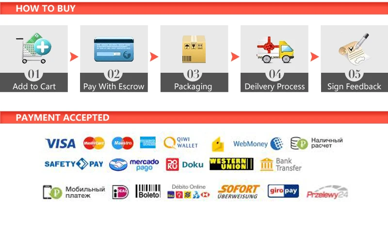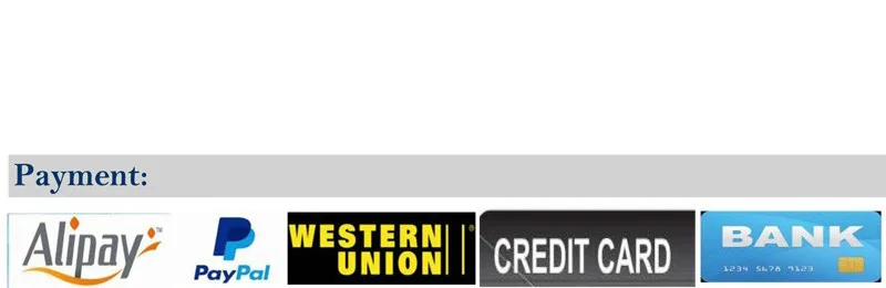 Você pode pagar via cartão de crédito ou outro cartão bancário privado via Alipay diretamente, você também pode pagar via Western Union ou Paypal ou transferência bancária T/T o dinheiro, por favor nos avise se tiver alguma dúvida.Obrigado.