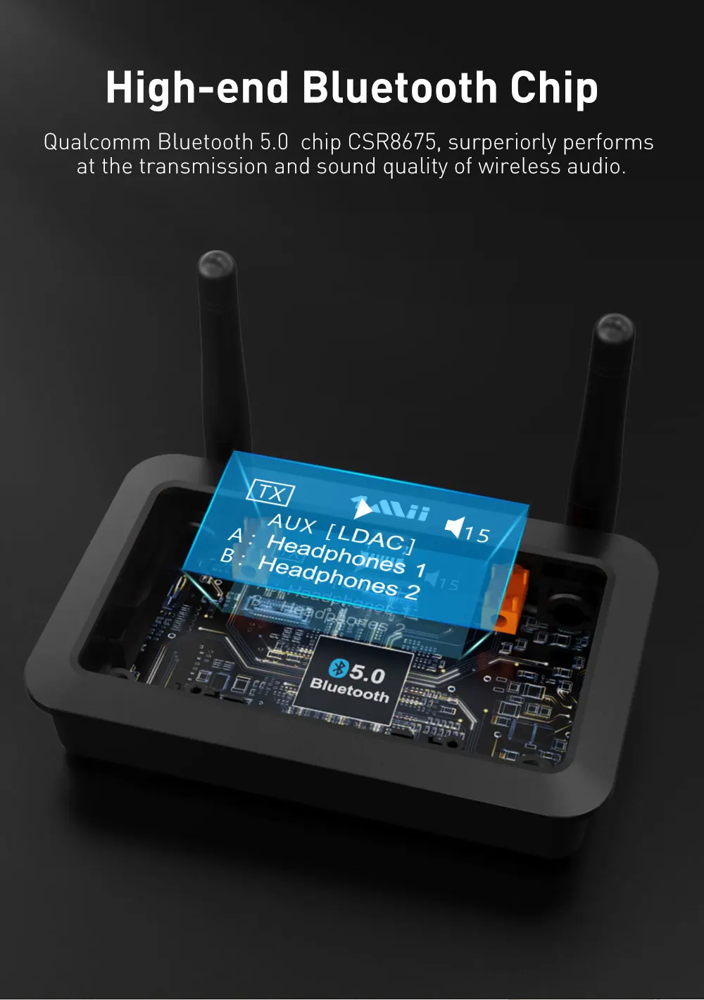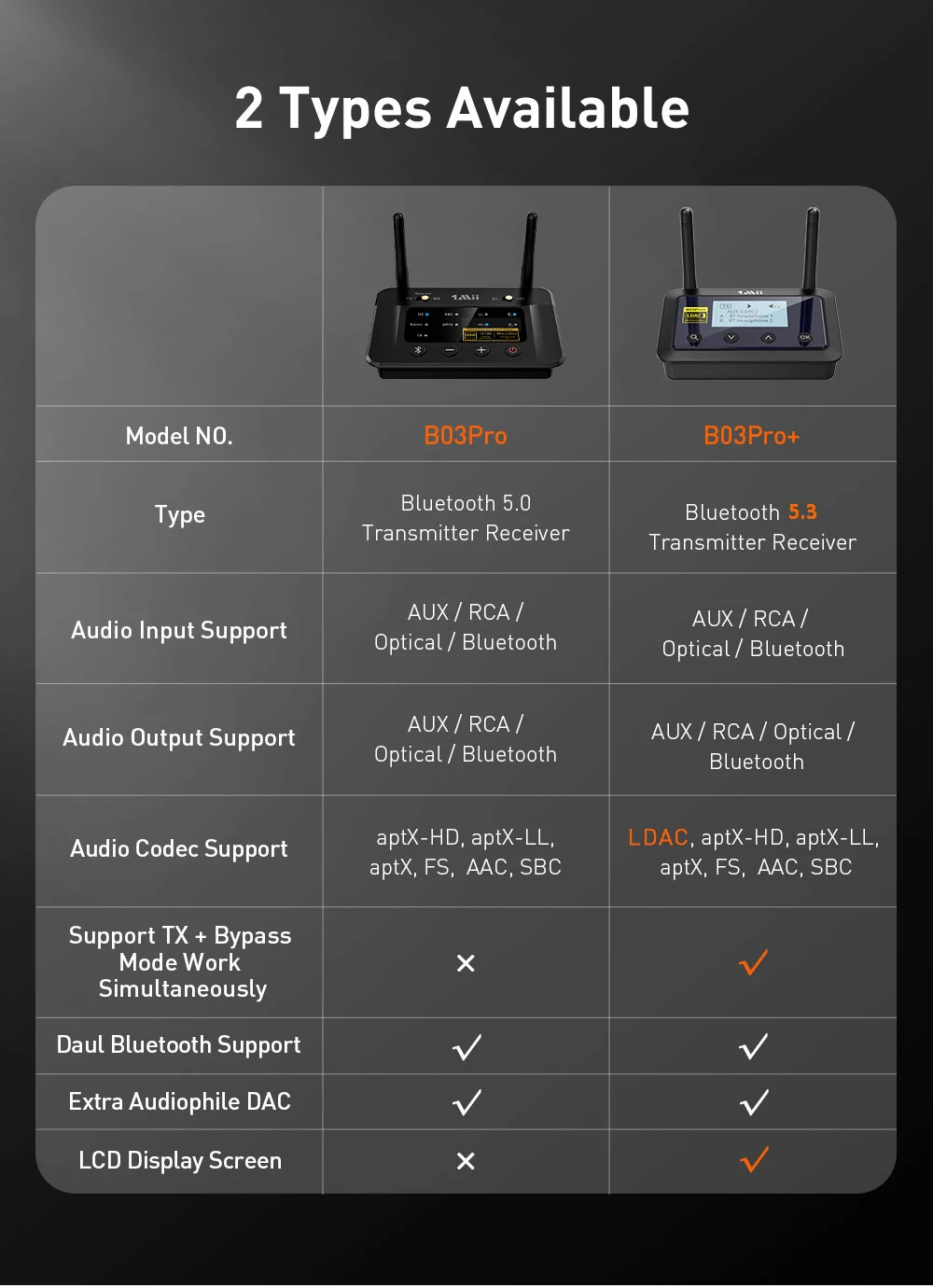 Receptor transmissor Bluetooth 1Mii B03 Pro+ Apresentando o mais recente Bluetooth 5.3 (CSR8675) e suporte para decodificação LDAC, aptX HD, aptX LL, SBC e AAC.