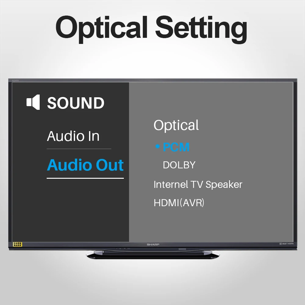 As fontes de áudio óptico digital para transmissão devem ser configuradas para PCM ou estéreo.A entrada Dolby / DTS não é suportada.Ou você pode não obter nenhum som.