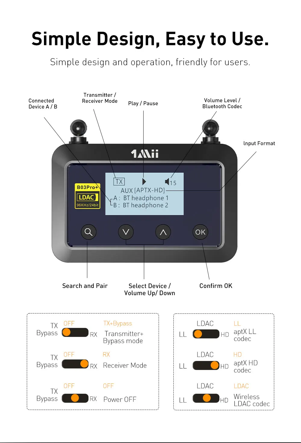 O adaptador Bluetooth 1Mii B03Pro+ foi projetado com uma tela muito bonita.Claro e legível durante a operação, você pode selecionar facilmente os fones de ouvido, alto-falantes ou celulares Bluetooth corretos.Receptor transmissor Bluetooth B03Pro+ também com botões de controle de volume.