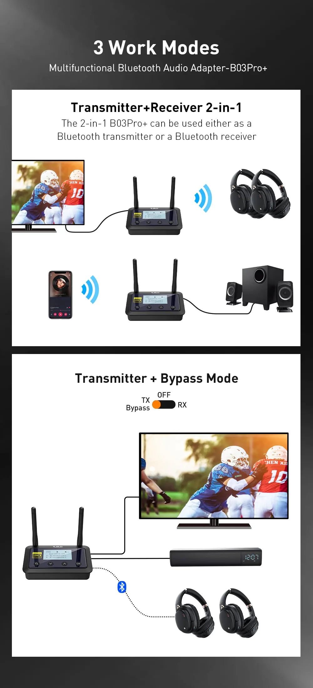 O transmissor Bluetooth B03Pro+ permite que você ouça fones de ouvido sem fio e alto-falantes/barra de som com fio ao mesmo tempo.Isso permite que o usuário do fone de ouvido ouça em um nível de volume diferente ao assistir TV com famílias; uma solução perfeita para uso familiar.