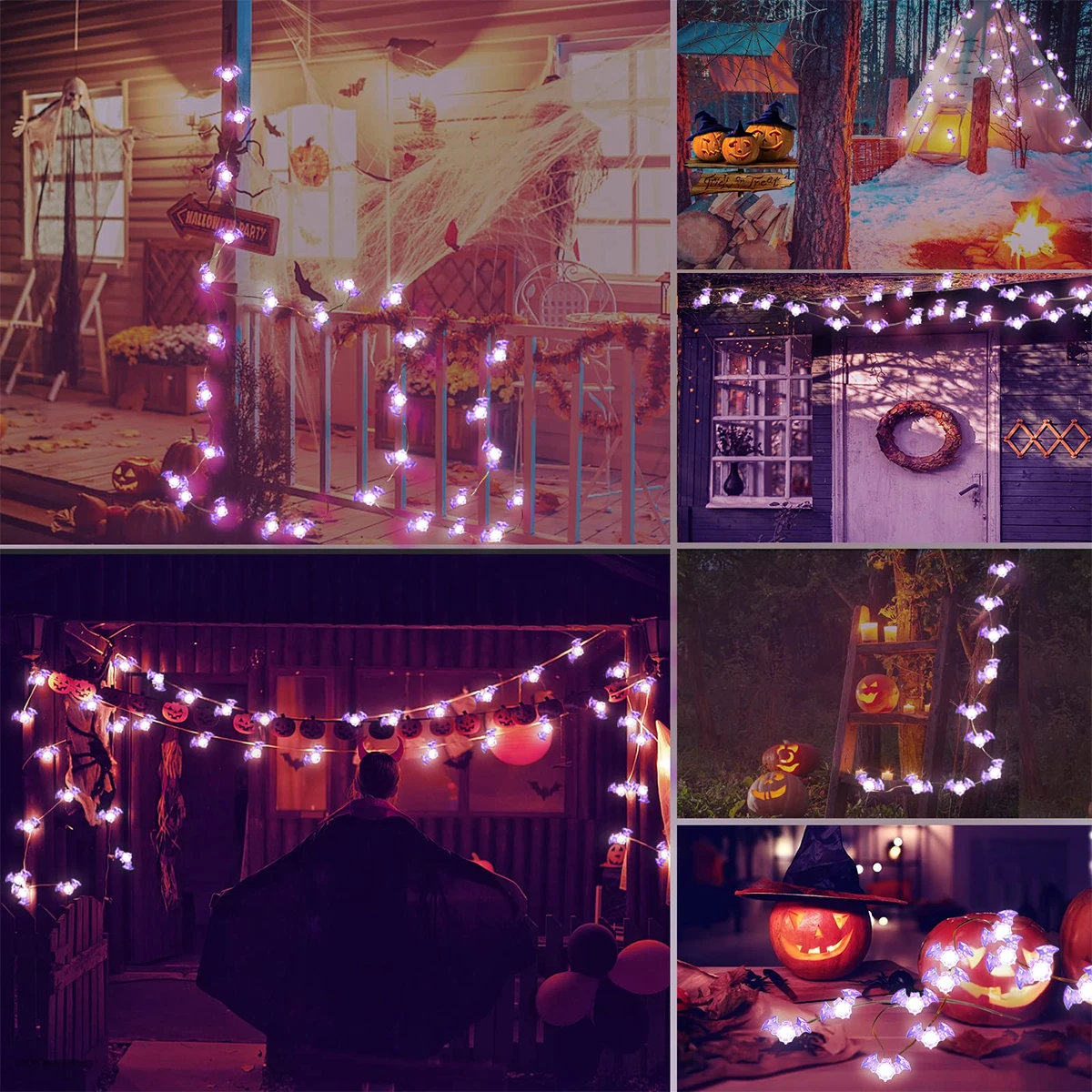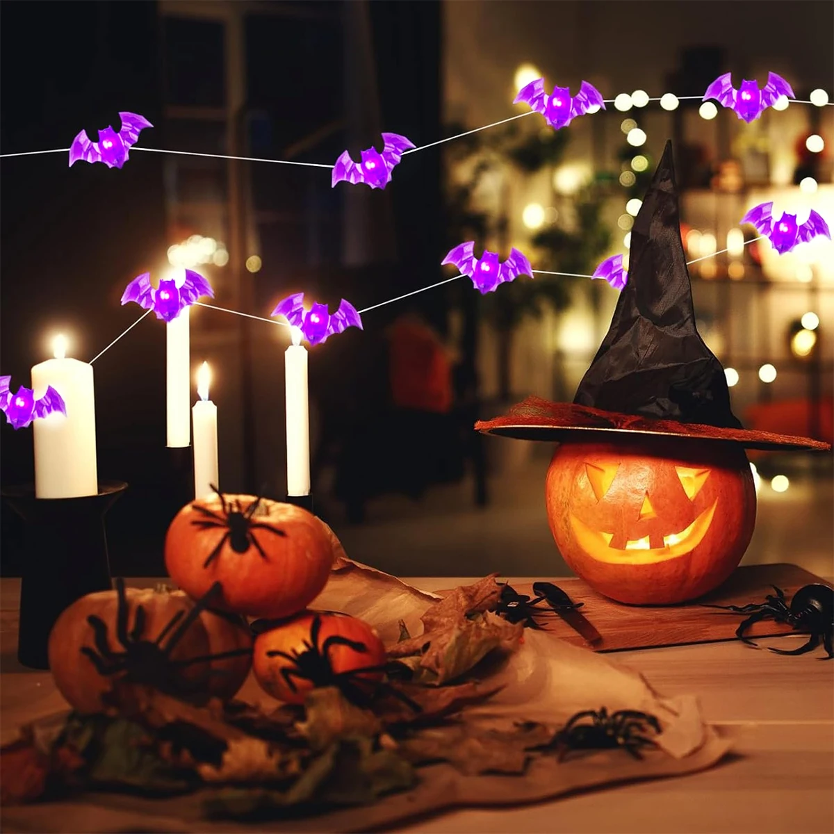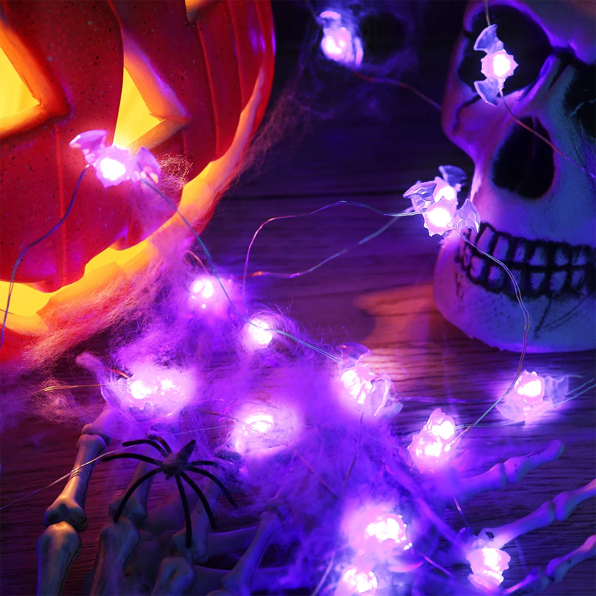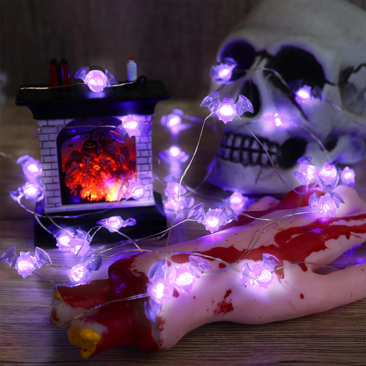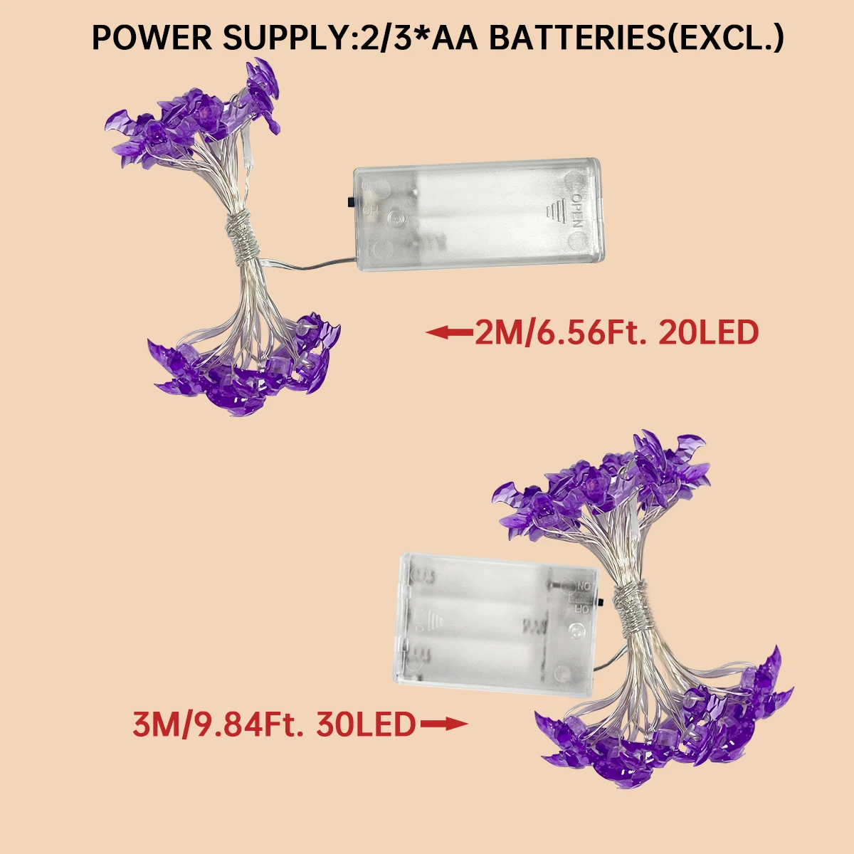 - > 1pc 20/30 led halloween bat fio de cobre luz da corda alimentado por bateria roxo morcego lâmpada de fadas para casa quarto festival festa decoração