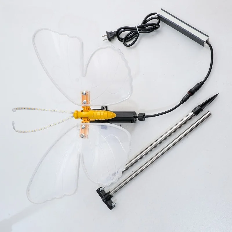 As borboletas são divididas em dois estilos: dinâmicas e estáticas. As borboletas dinâmicas têm asas que se movem, enquanto as borboletas estáticas não. Se precisar inserir um poste no chão, por favor, preste atenção ao comprar com um suporte ao fazer o pedido.