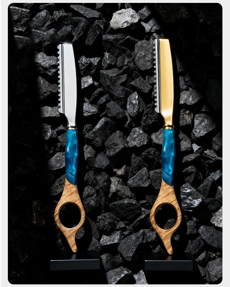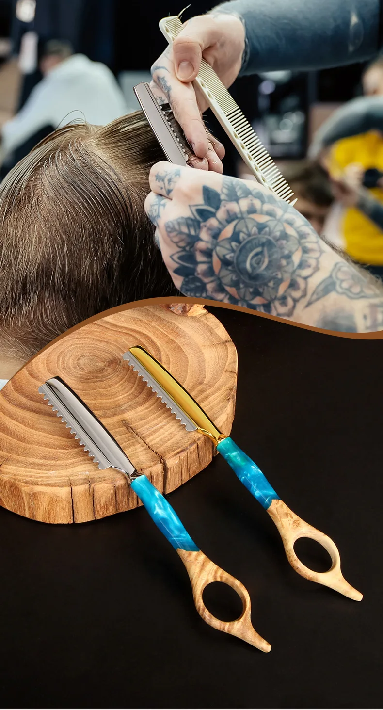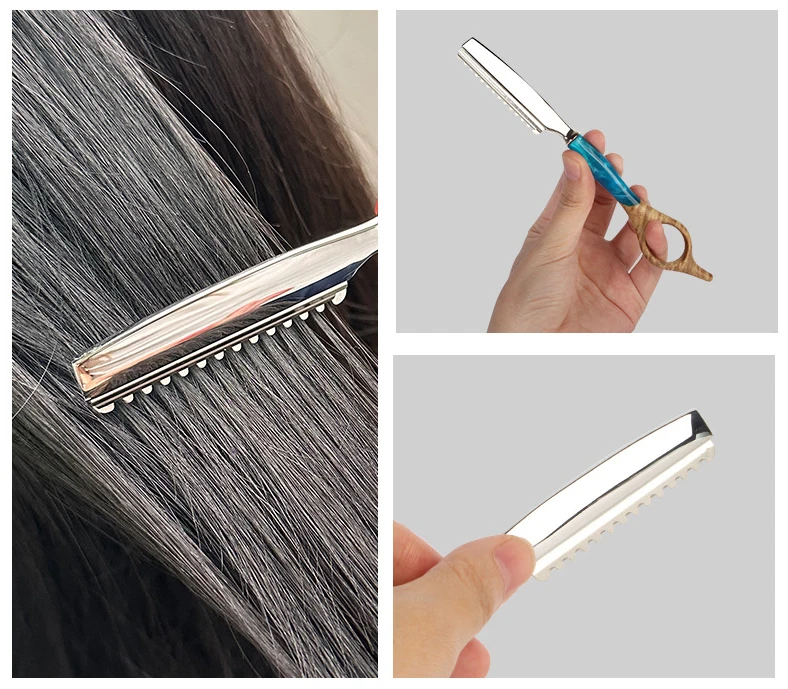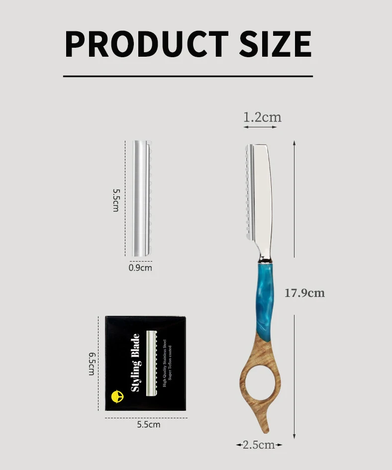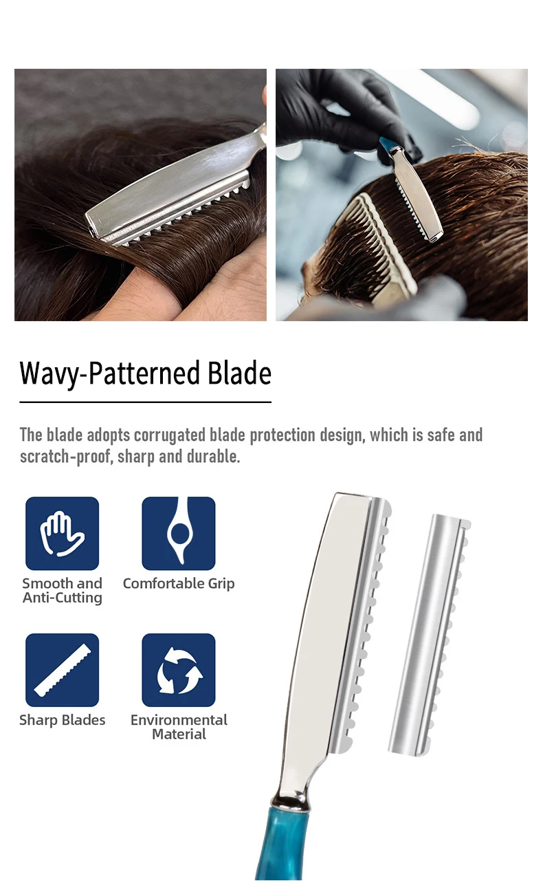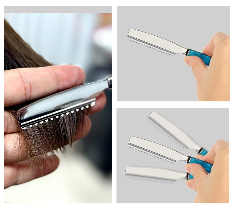 -A borda fina da navalha pode ser usada para franjas finas, barbear, aparar cabelos, etc., você também pode usá-los para aparar perucas e cerdas de animais de estimação. Faca de desbaste de cabelo favorita para estilistas e barbeiros, adequada para todos os tipos de cabelo.