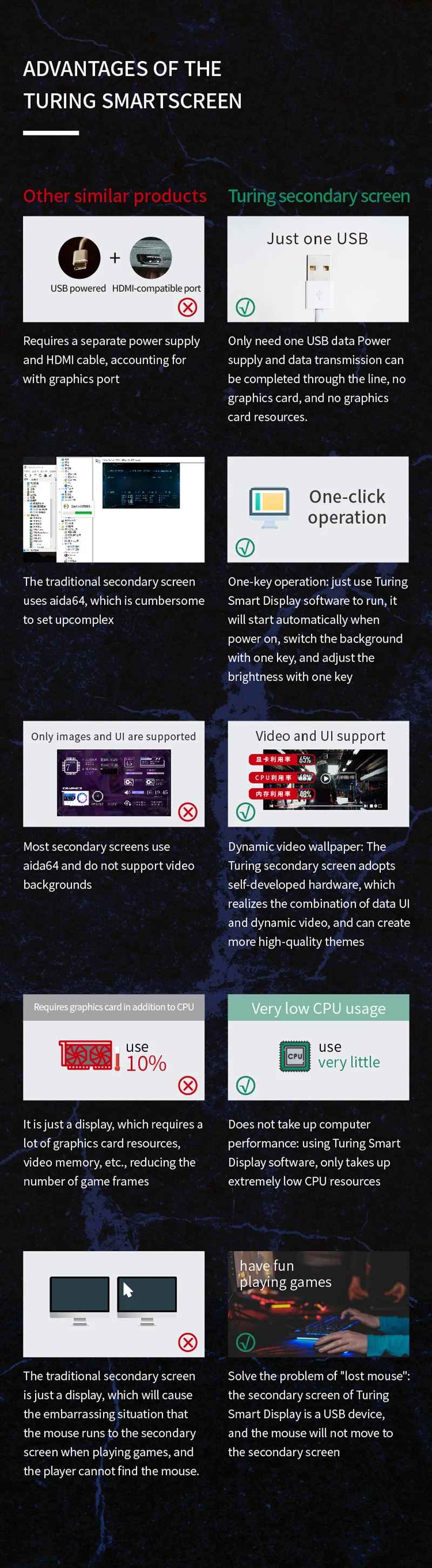 Com software autodesenvolvido (TURZX), não usa AIDA64 e ocupa menos recursos, não precisa de cabo compatível com HDMI.