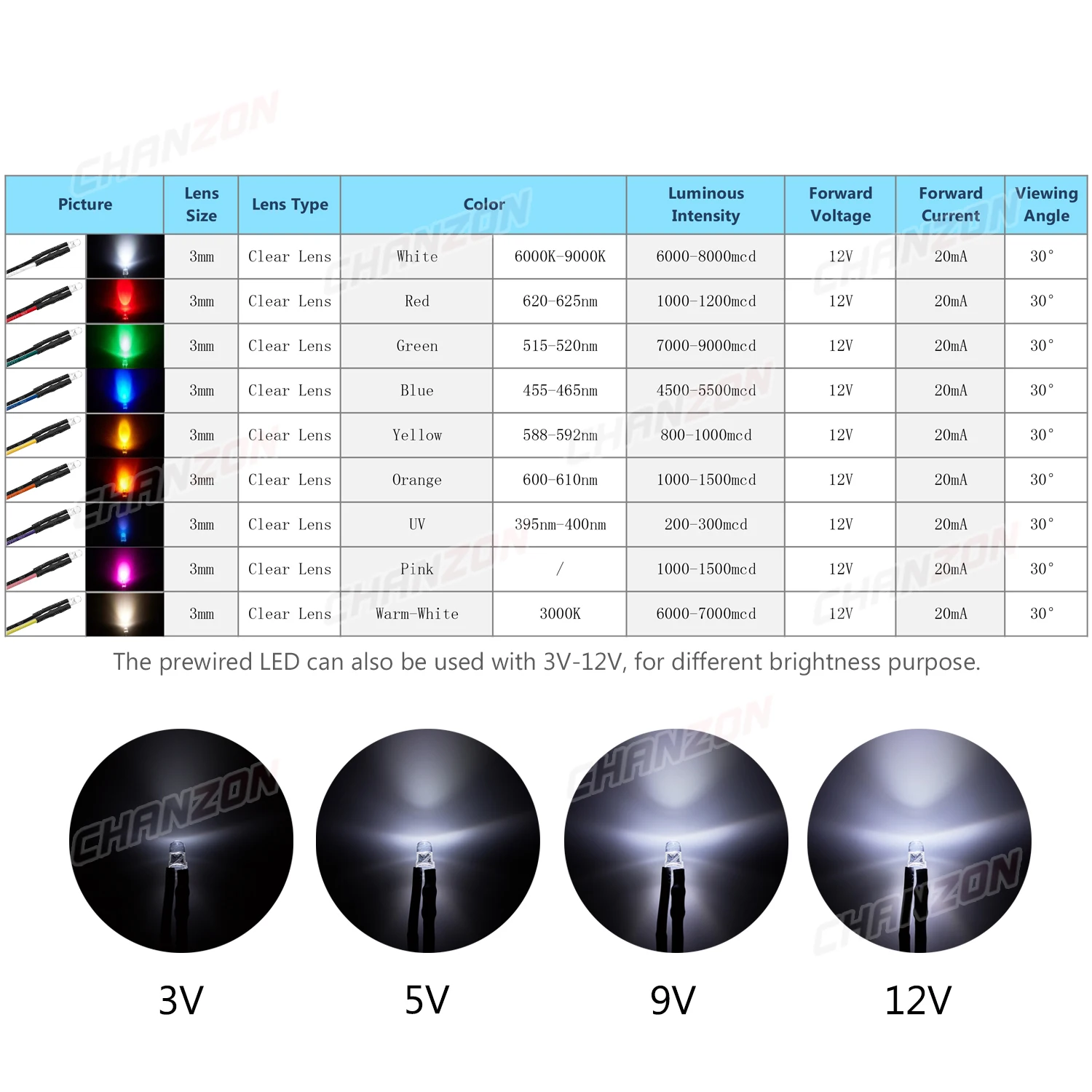 20 peças 3mm diodo led 12v branco quente vermelho verde azul amarelo laranja uv roxo rosa pré-fio 5 9 12 v lâmpada indicadora emissora de luz