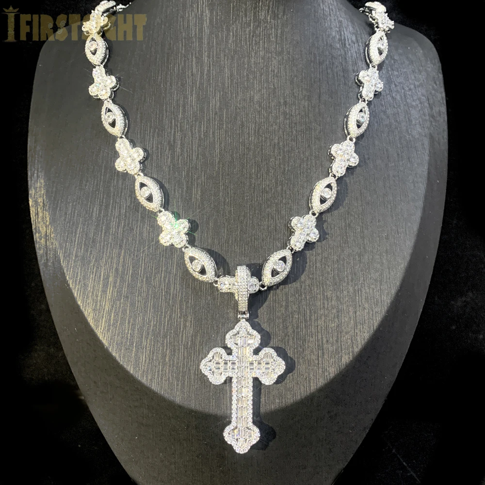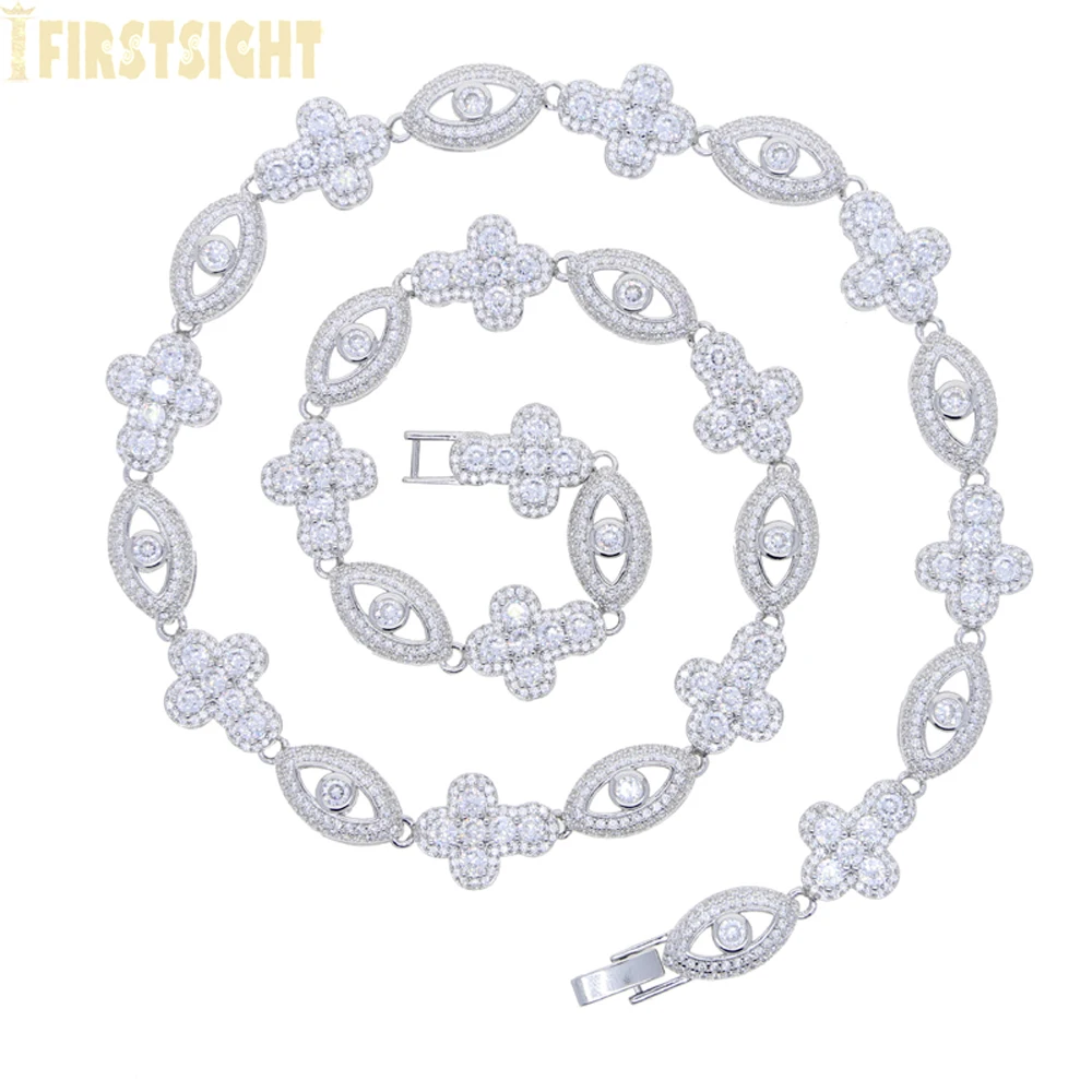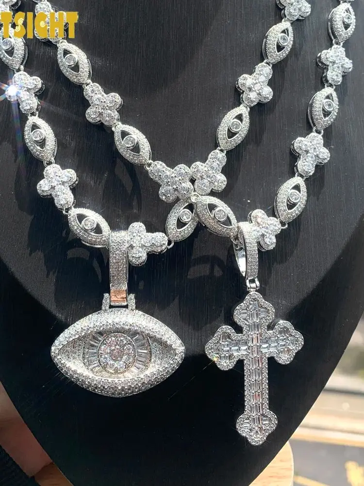 2025 novo olho cruz colar gelado para fora bling cor prata zircônia cúbica charme tênis corrente para homens mulheres hip hop jóias