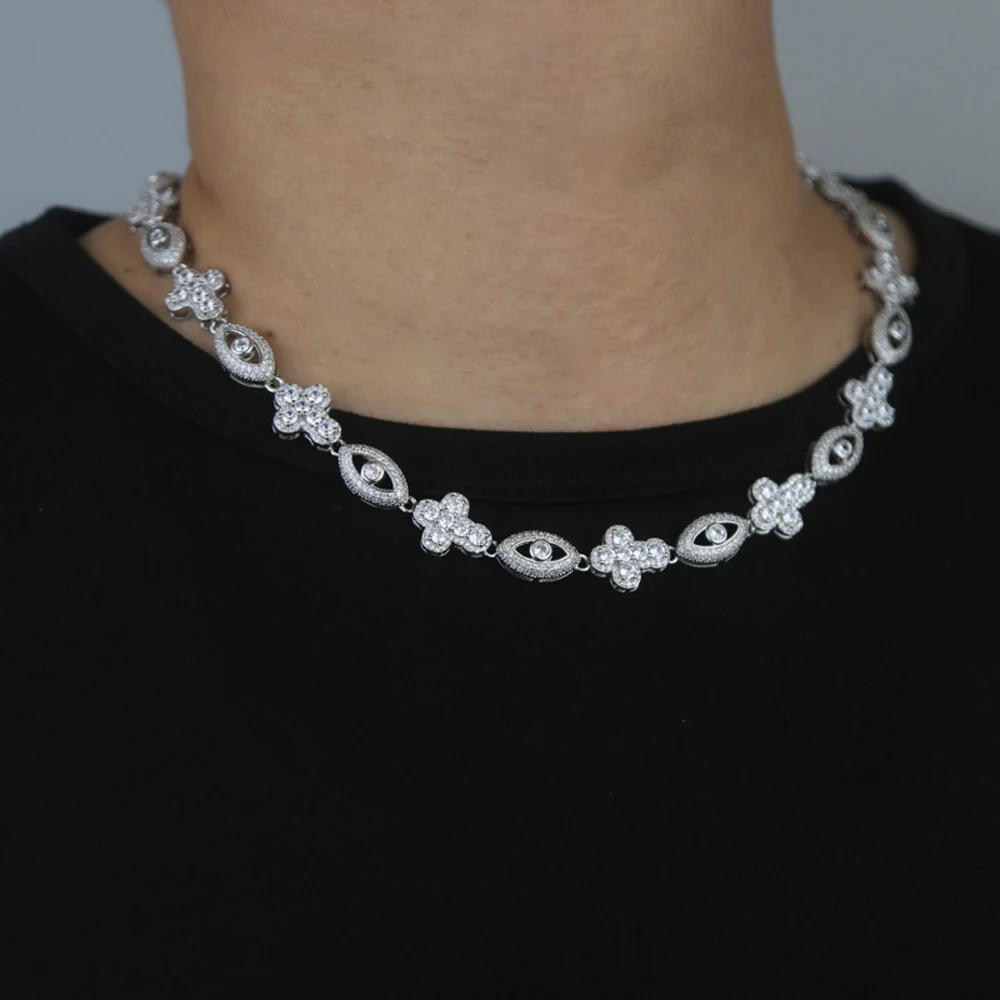 - > 2025 novo olho cruz colar gelado para fora bling cor prata zircônia cúbica charme tênis corrente para homens mulheres hip hop jóias
