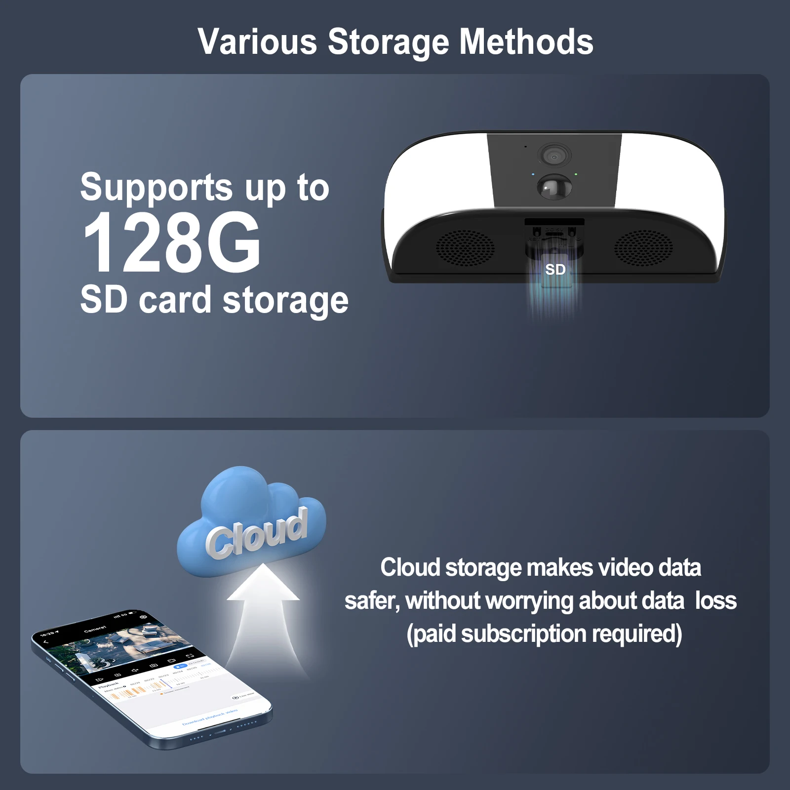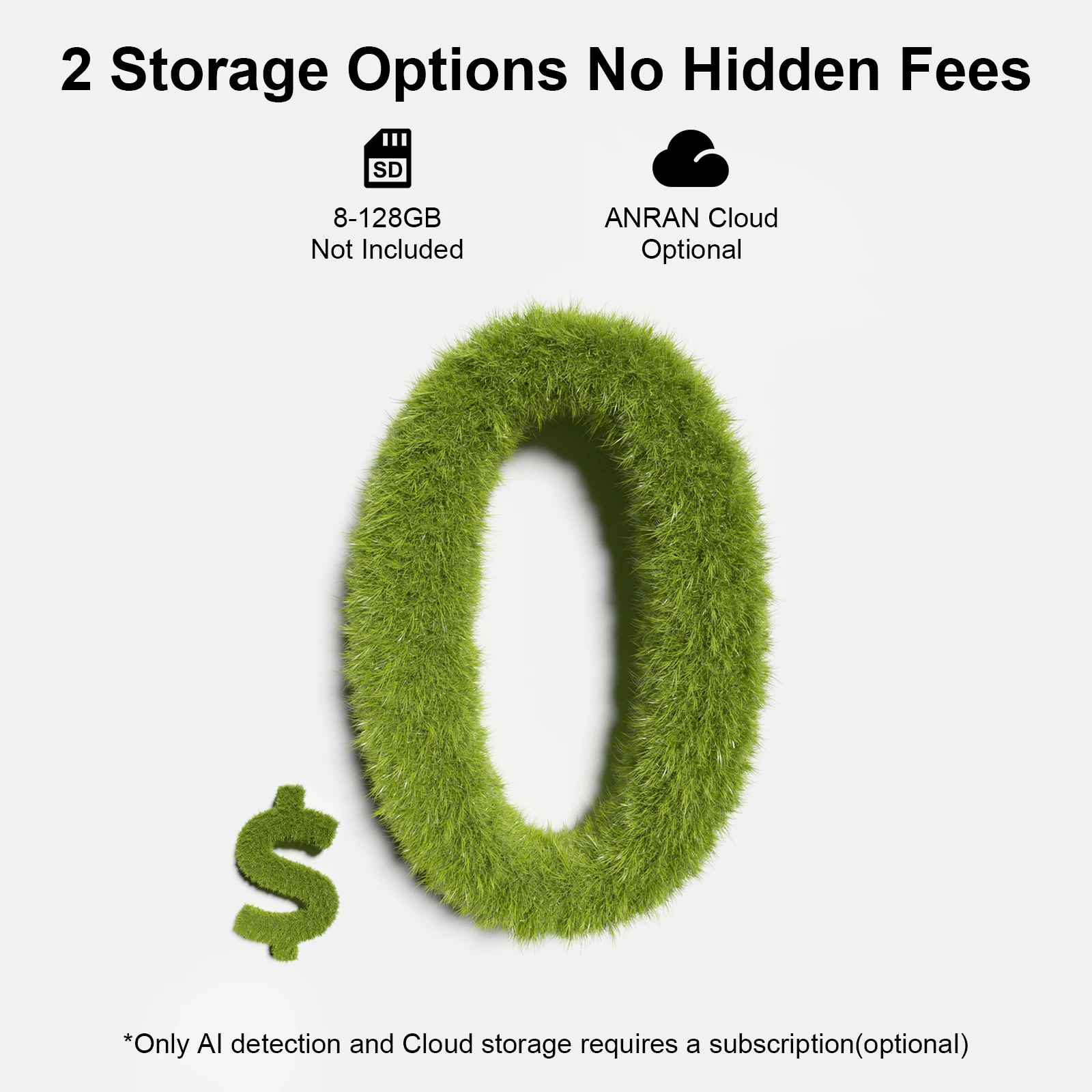 A câmera oferece serviços permanentemente gratuitos de armazenamento em nuvem por 7 dias, cada gravação dura 6 segundos.Se precisar de armazenamento por gravação mais longa, você pode adquirir espaço de armazenamento no ANRAN APP de acordo com suas necessidades.E também suporta o modo de armazenamento em cartão SD, você pode inserir um cartão de memória de 8-128 GB (não incluído).