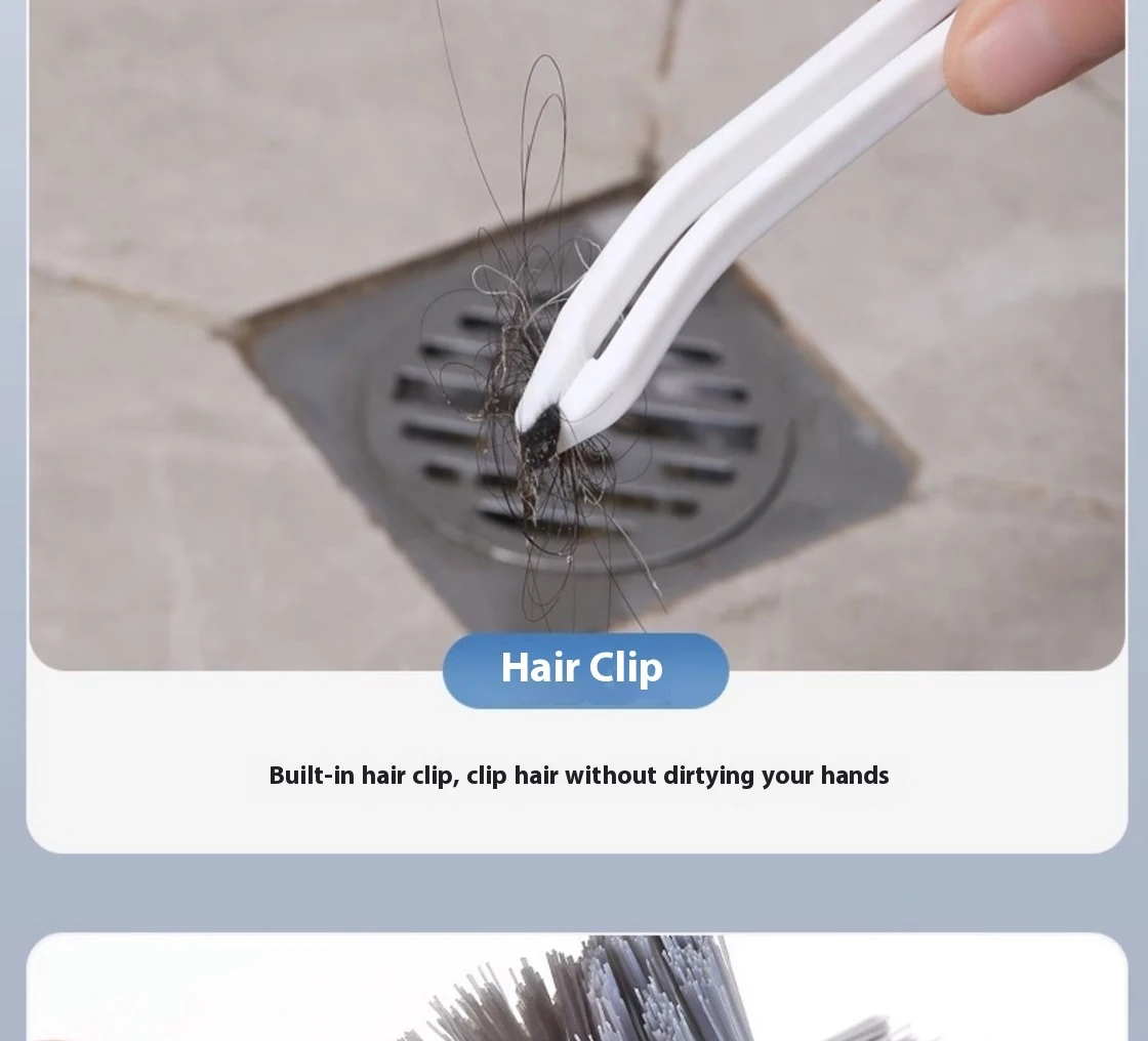 2.Quando o clipe da escova for usado, você pode retirar os cabelos usados para limpar a boca da tubulação de água.Ao armazenar, você pode incorporar o cabo do pincel para economizar espaço.