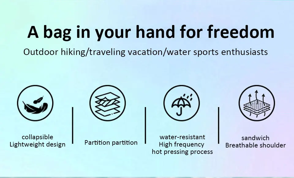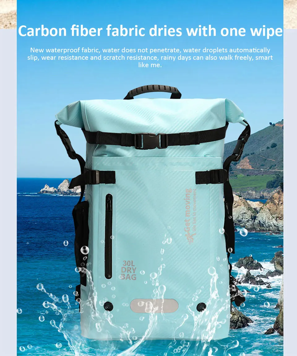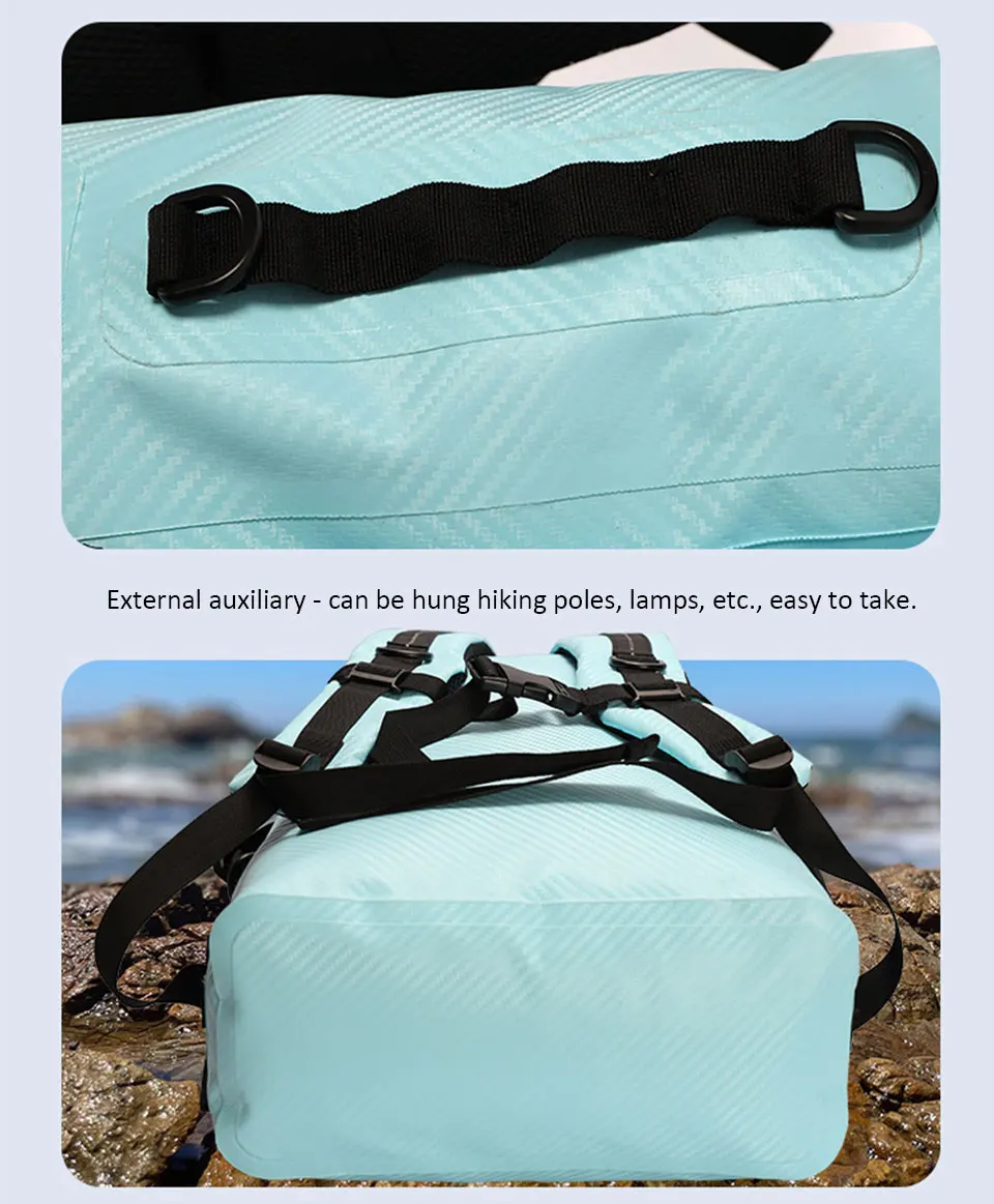 1.Tecido de fibra de carbono, impermeável e leve: A mochila é confeccionada em tecido impermeável totalmente novo, que não é permeável à água e possui excelentes propriedades impermeáveis, ao mesmo tempo que é muito leve.O design leve e dobrável é particularmente adequado para viagens ou esportes aquáticos.