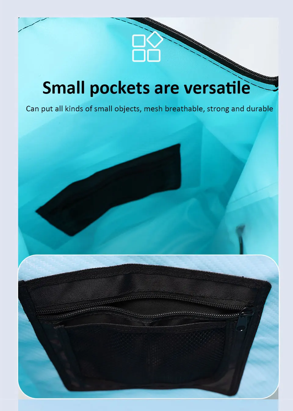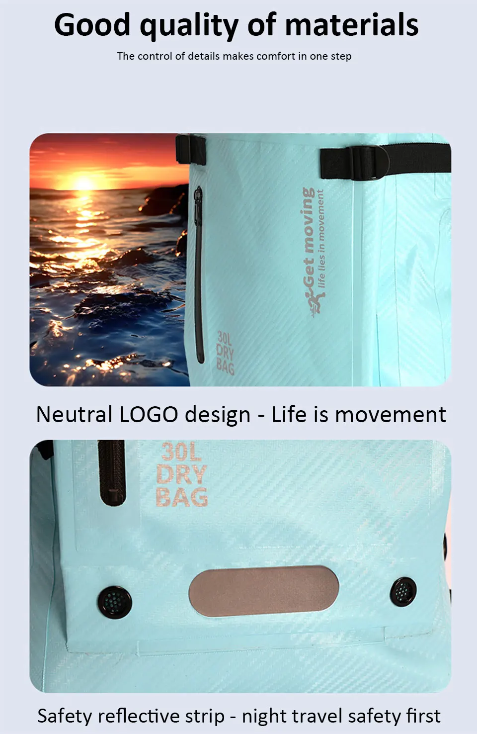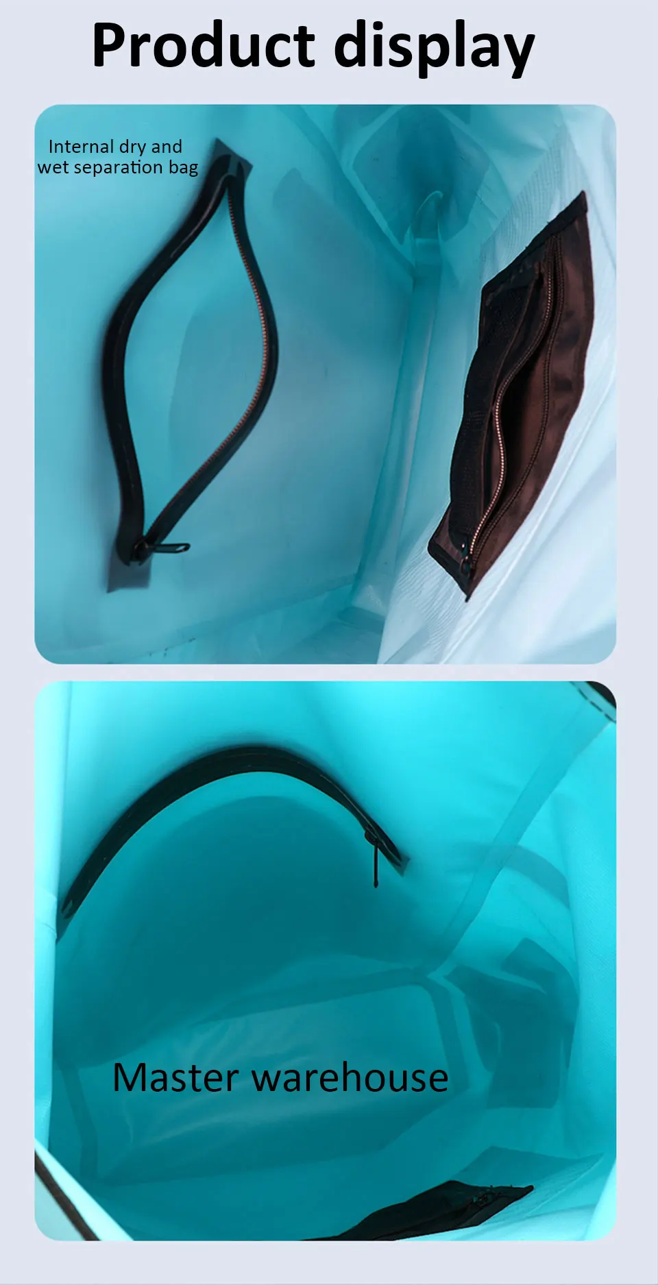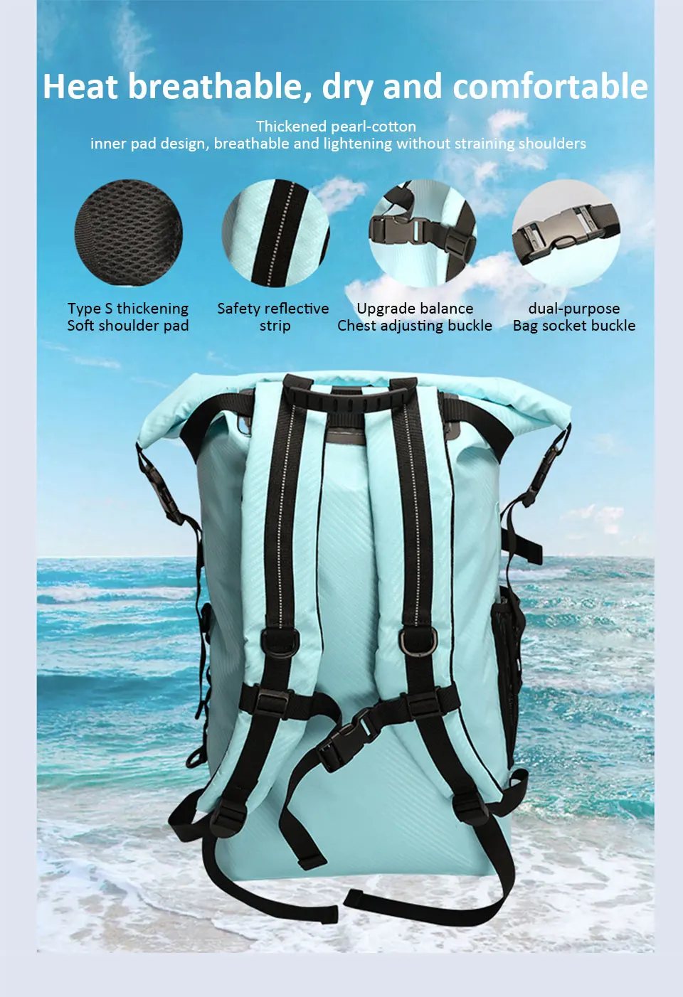 8.Características: Grande capacidade em ambos os ombros, separação seca e úmida, repelente de água, fivela multifuncional, faixa reflexiva de segurança, etc.