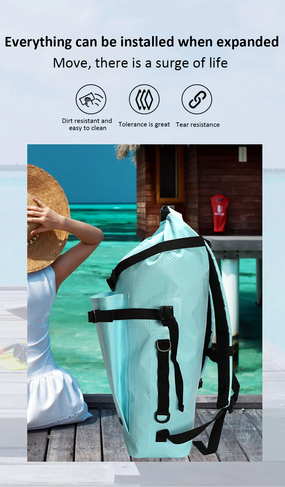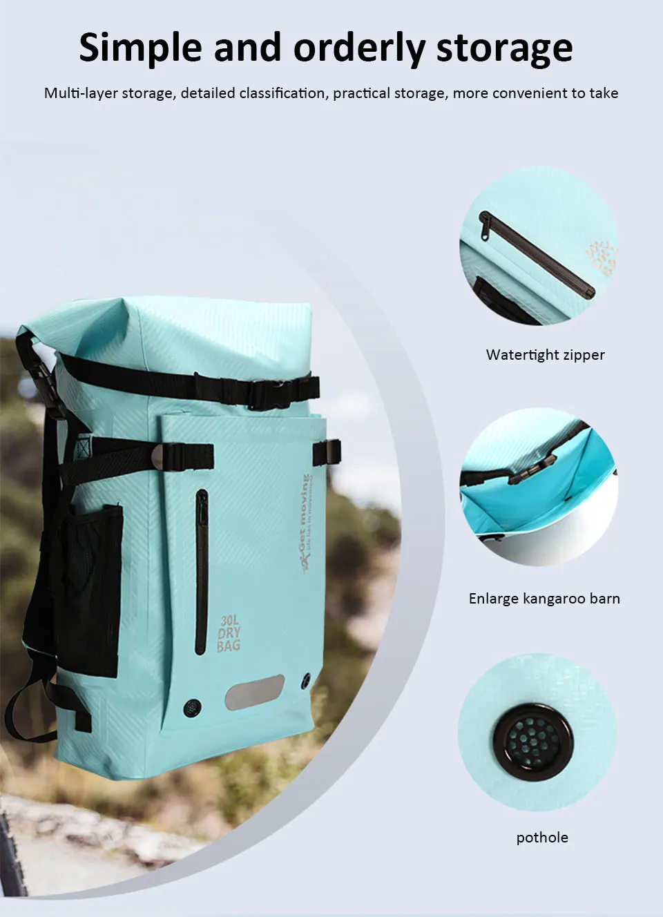 3.Processo de prensagem a quente de alta frequência repelente à água: Toda a bolsa é perfeitamente prensada a quente, melhorando a capacidade à prova d'água da mochila e permitindo que você participe de vários esportes aquáticos com mais tranquilidade.