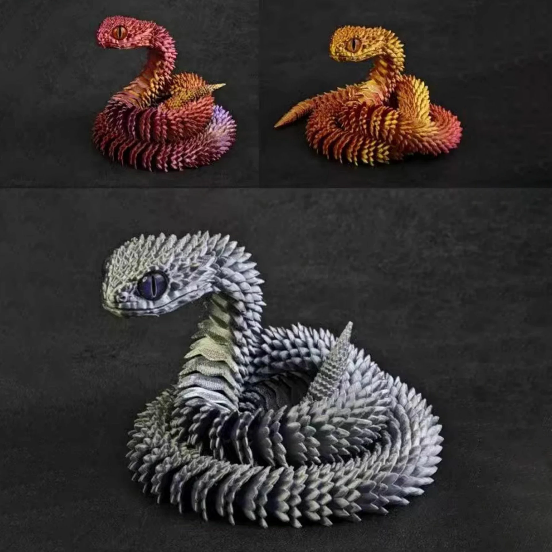 1. material pla: feito de material pla, durável e ecológico.(Nota:Devido à natureza especial da impressão 3D, a ordem das cores do corpo da cobra pode variar.)