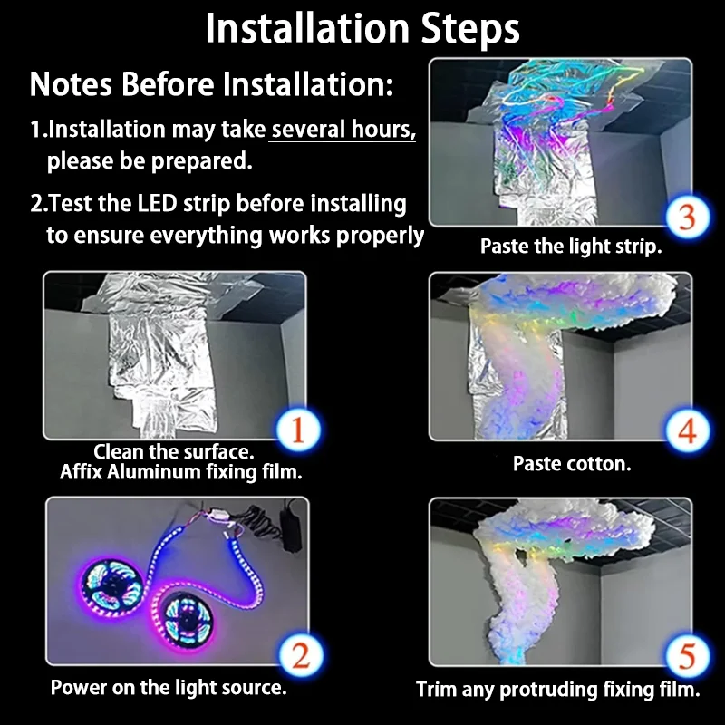 Vem com uma fita LED segura, algodão retardante de chamas e filmes de fixação para garantir tanto a criatividade quanto a segurança. A faixa de LED é longa o suficiente para decorar diversos espaços como quarto, teto, cozinha, escadas, locais de festas, casamentos, janelas, sala, atrás da TV e muito mais. Ajuste o posicionamento e a densidade para projetar seu céu tempestuoso personalizado!