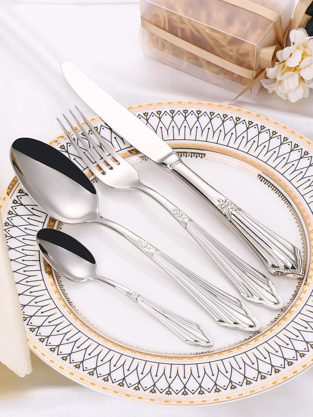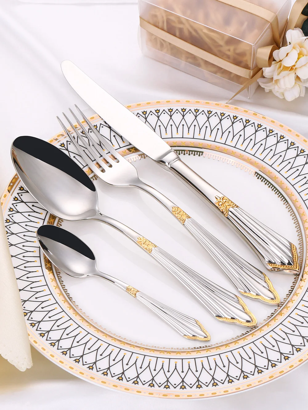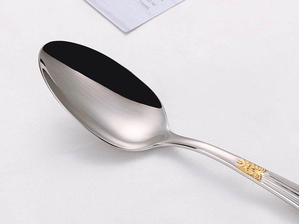 O conjunto de utensílios de servir polido espelhado cria uma cena de jantar elegante, nobre e luxuosa, tornando sua mesa de jantar única.