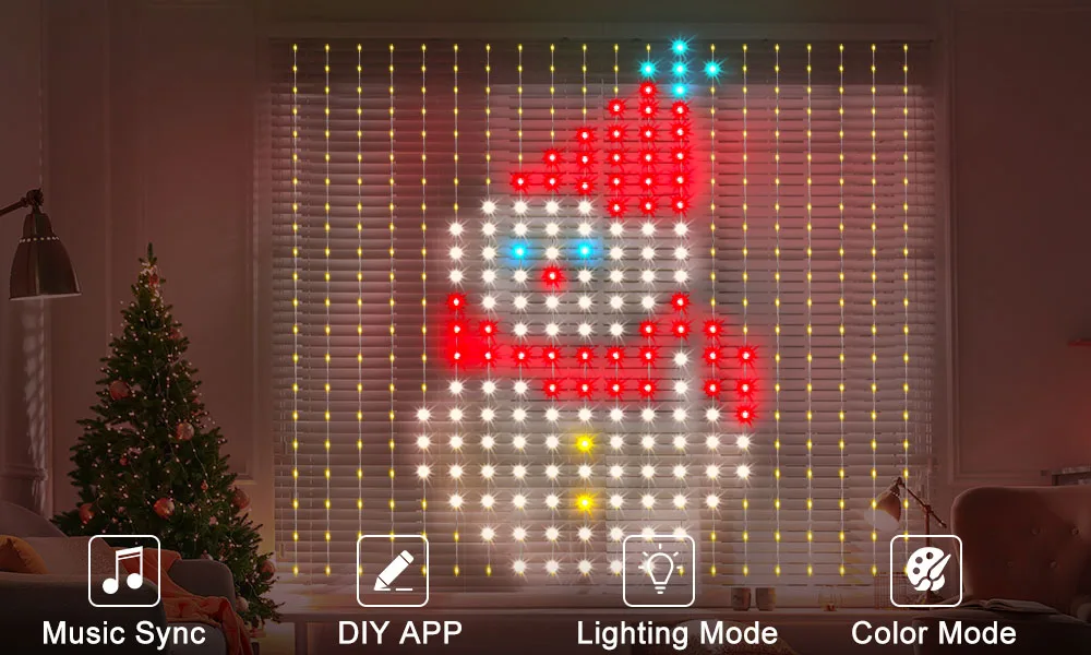 【5 luzes de sincronização de música】 As luzes de cortina de luz de fundo podem mudar de cor e padrão com o ritmo da sua música favorita. As cortinas de luzes que mudam de cor, com uma enorme gama de 400 LEDs, mostrarão o ritmo da música na sua festa com 5 padrões.