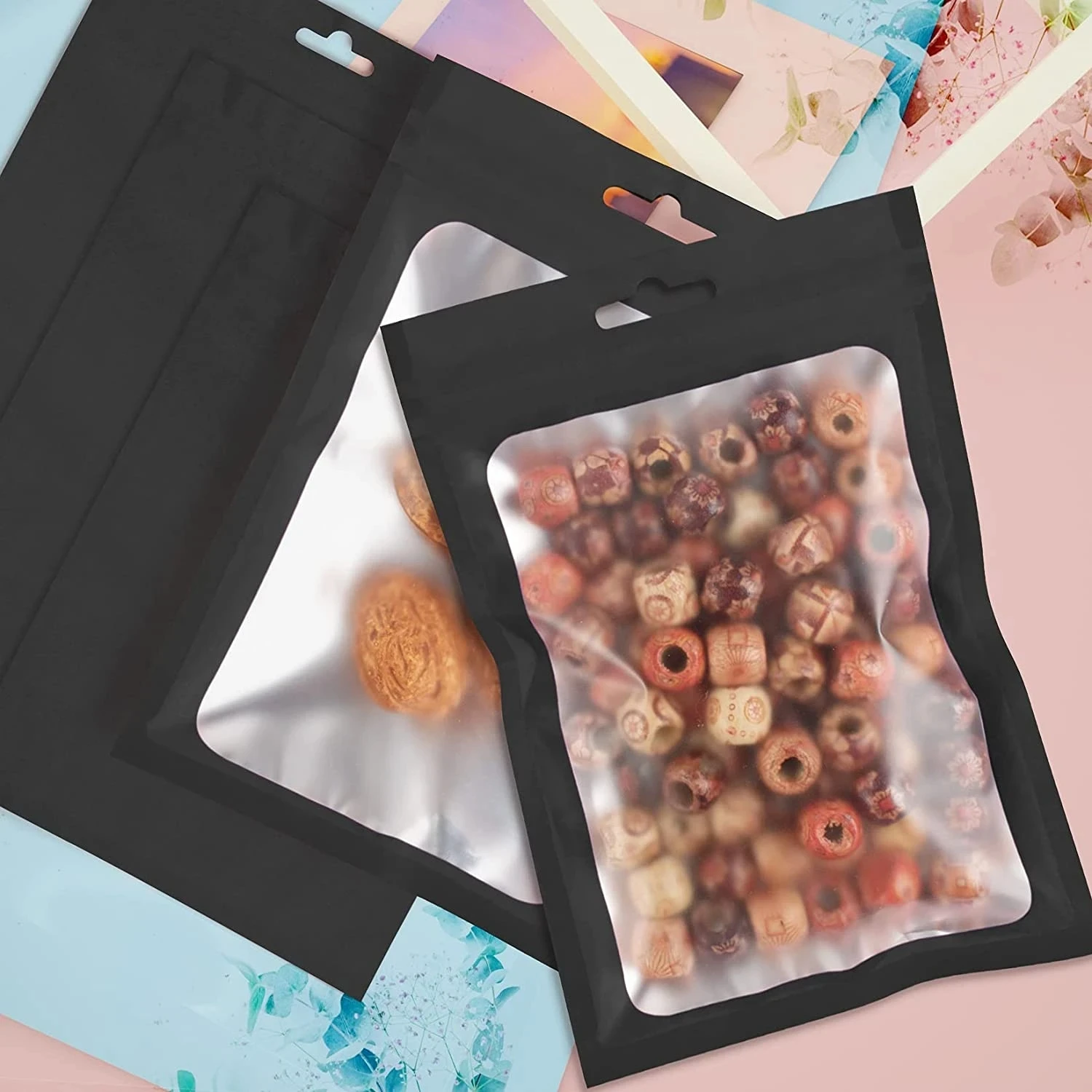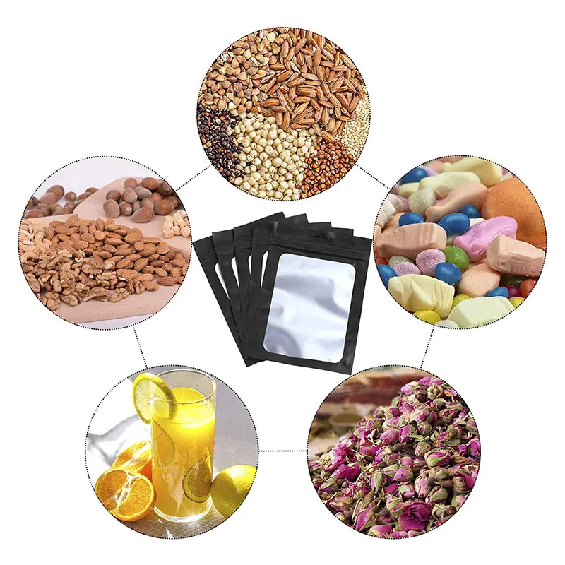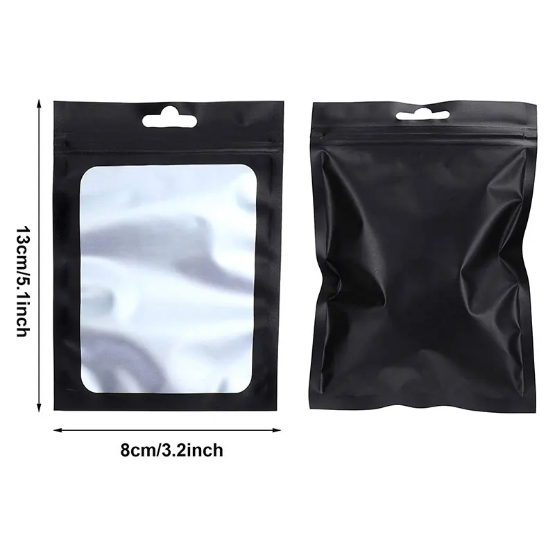 - > 50 pçs sacos de folha preta mylar zíper pendurar saco com janela clara para exibição de jóias embalagem auto selagem reutilizável folha bolsa