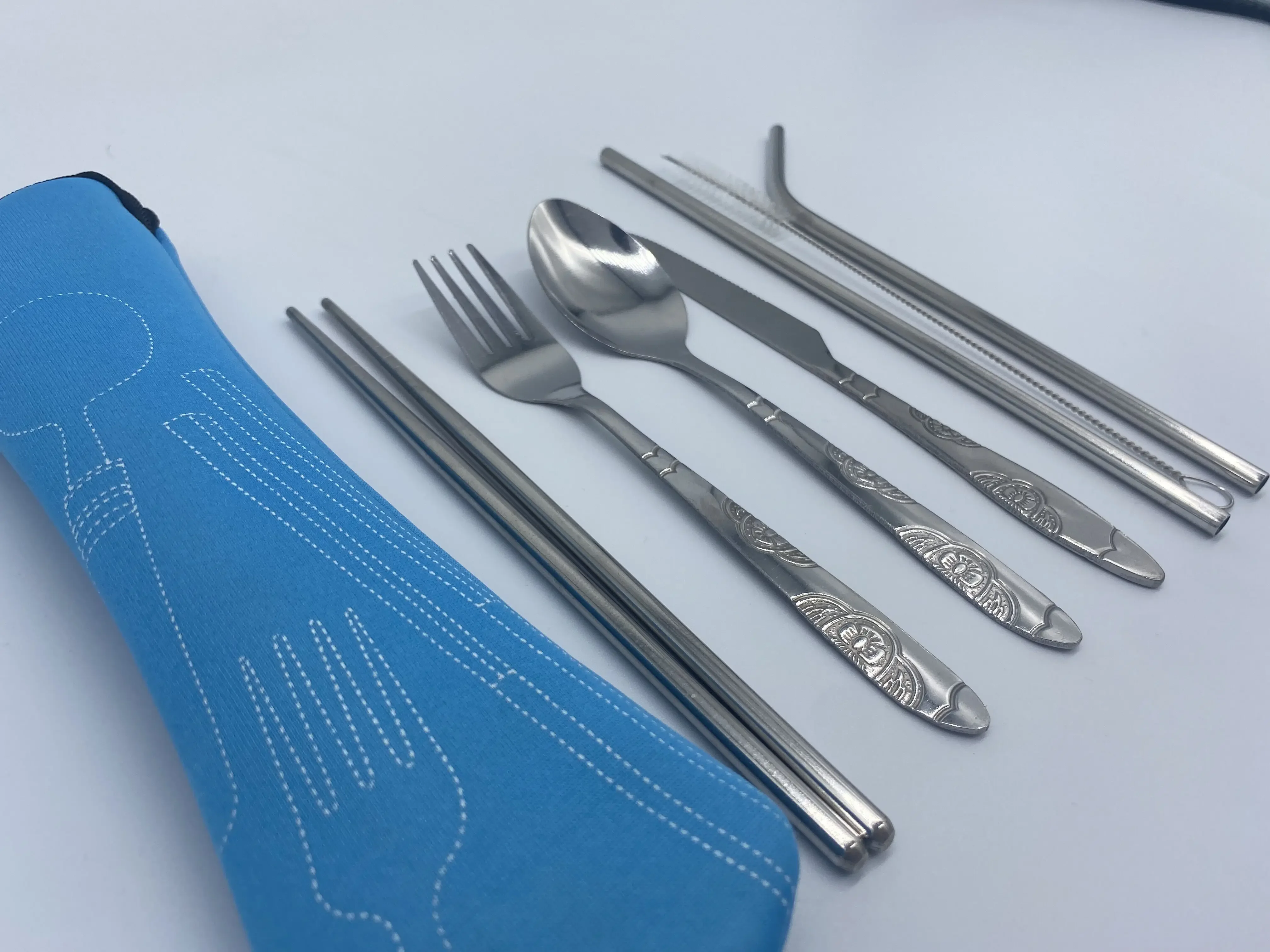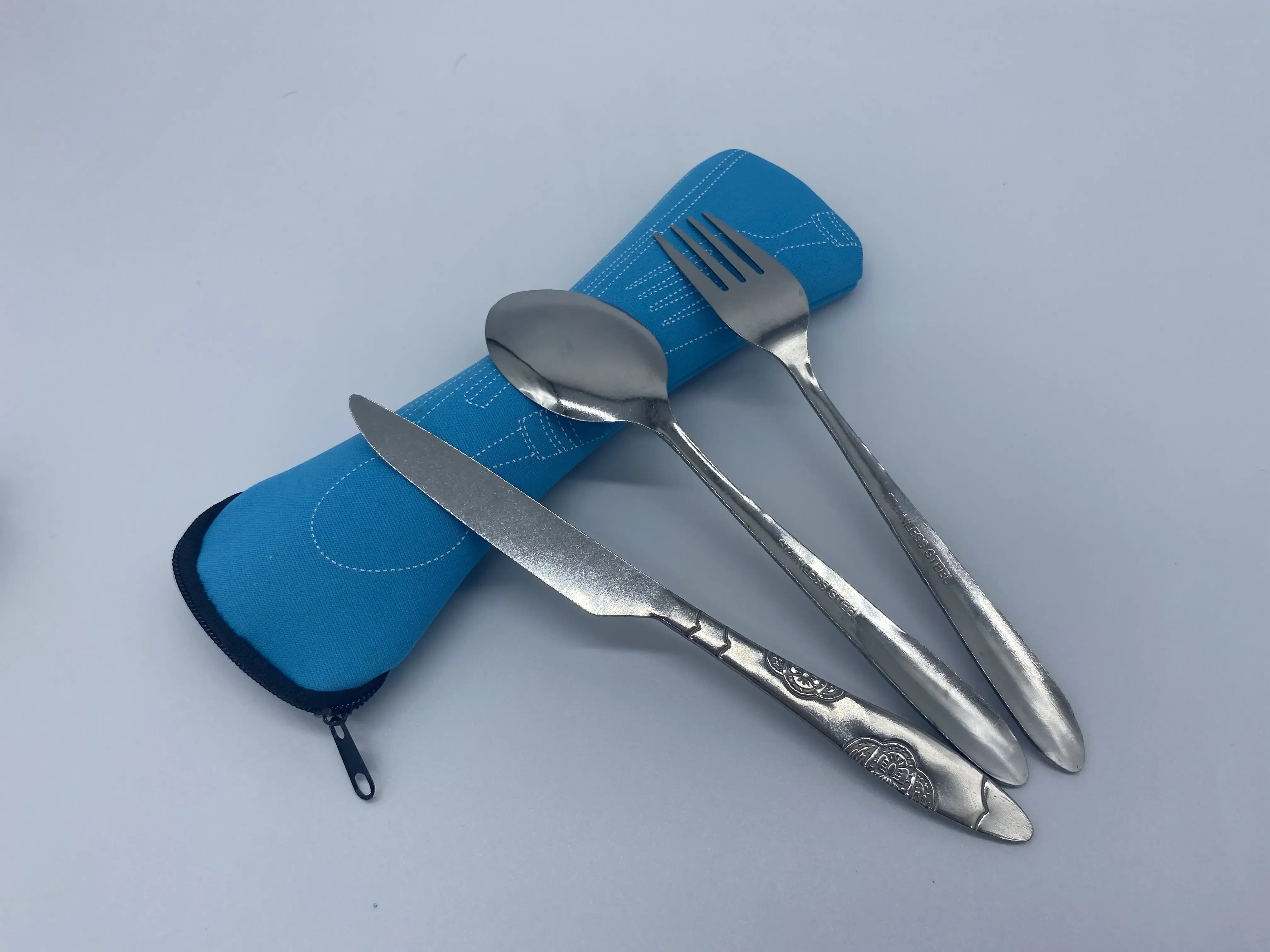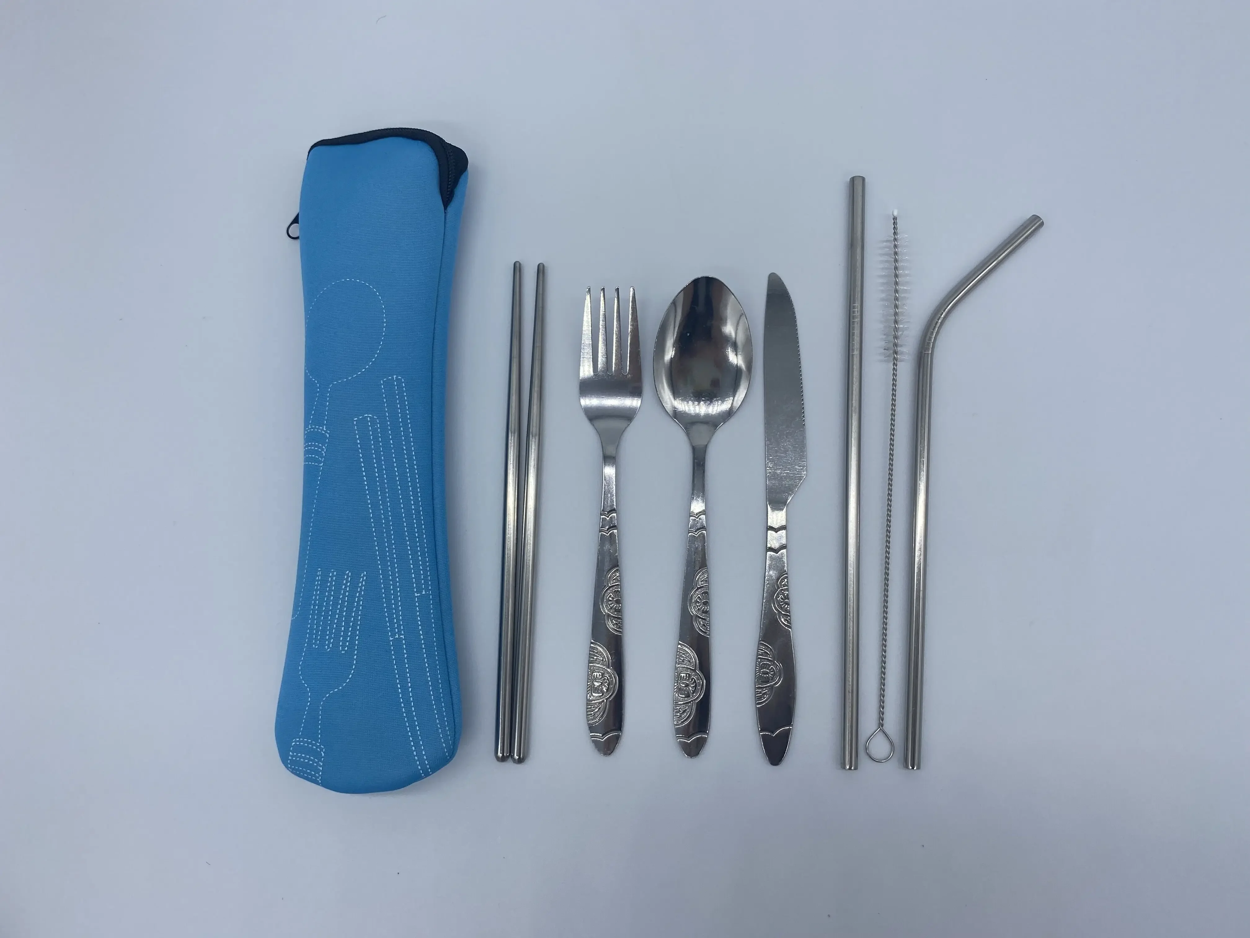 Os talheres mantidos limpos e armazenados de forma compacta em um estojo de neoprene elegante e lavável