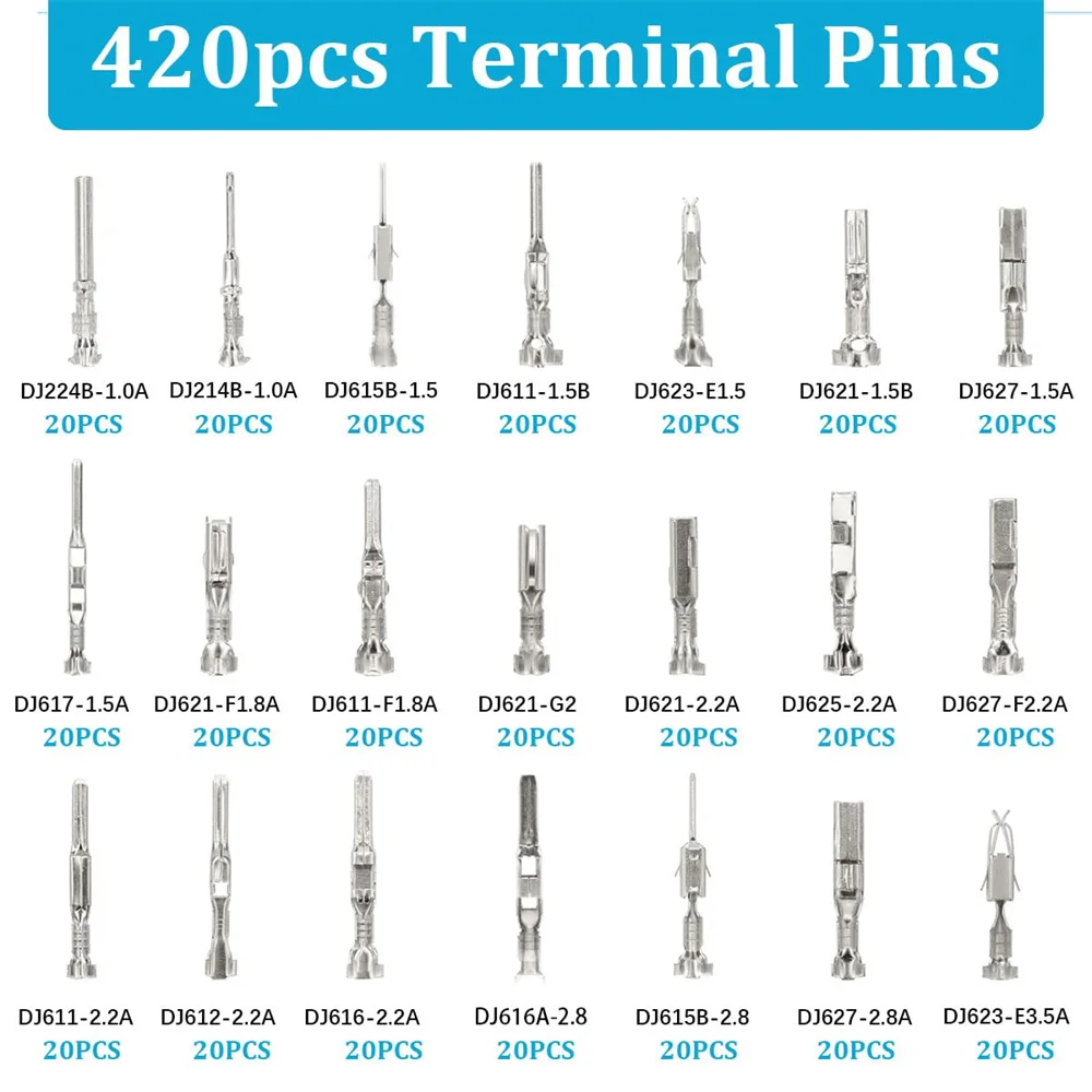 A embalagem inclui: um total de 21 tipos de pinos terminais de 420 unidades são colocados na caixa, o que é conveniente para levar, armazenar e muito conveniente.
