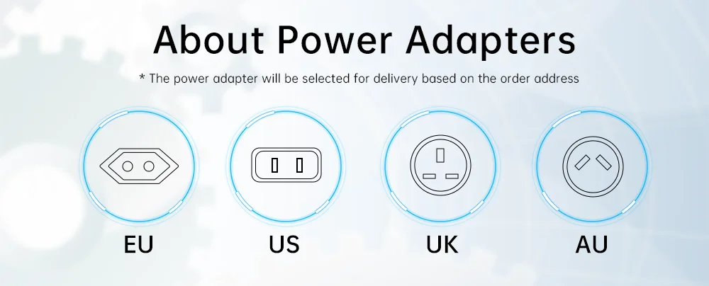 Temos quatro especificações diferentes de fonte de alimentação.UE/EUA/Reino Unido/AU/JP