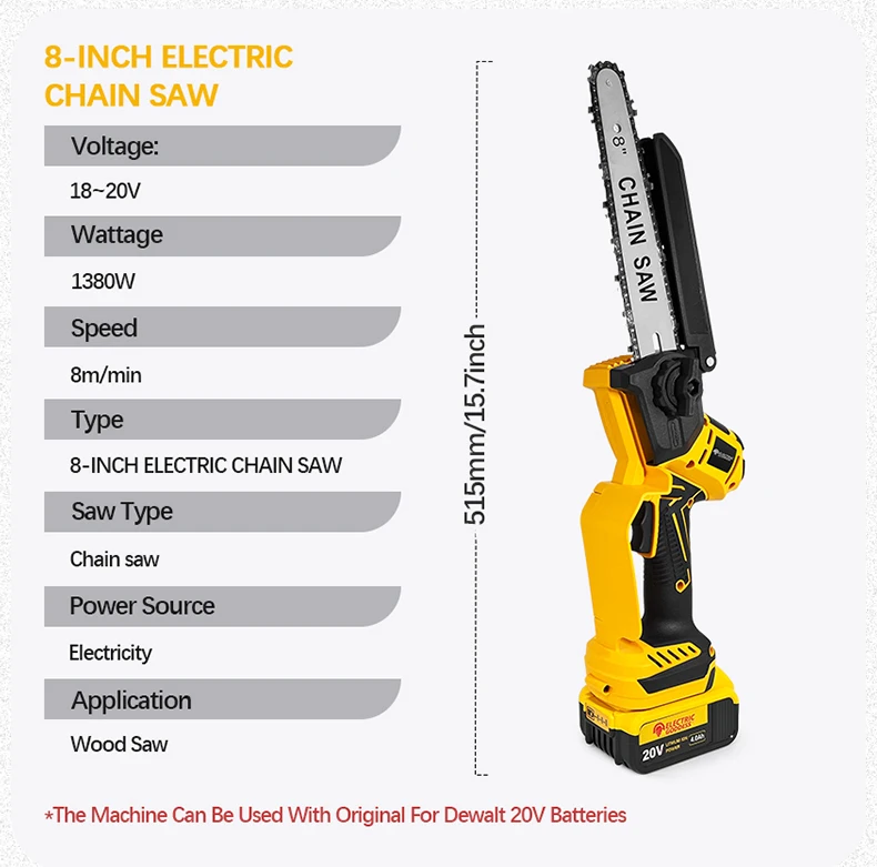 - > 8 Polegada 1380w sem escova amarelo serra elétrica profissional jardim poda serra ferramenta elétrica para dewalt 20v bateria pino