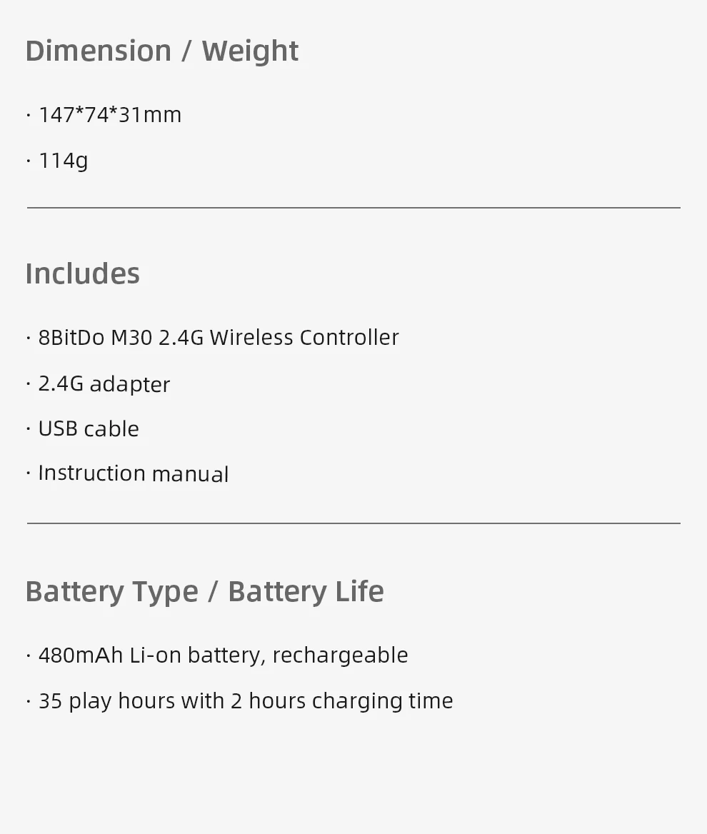 Includes: M30 2.4G Controller, 2.4G Wireless Receiver, USB Cable