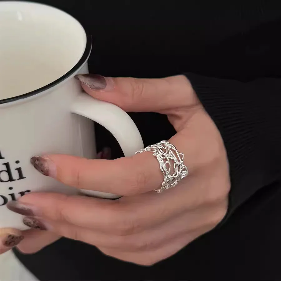 925 prata esterlina oco para fora linha anel para mulher malha irregular punk geométrico jóias presente atacado