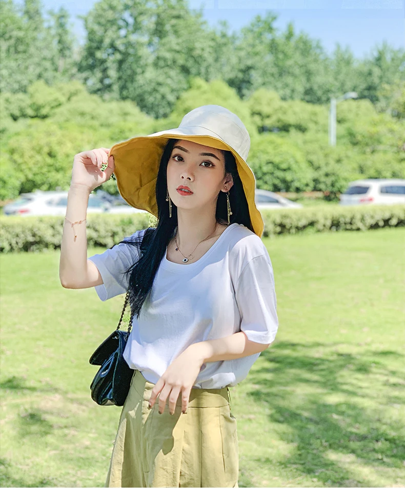 - > Aba larga upf 50 + chapéu de sol feminino proteção anti-uv caminhadas pescador boné dobrável verão sólido praia chapéu 2024 dupla face chapéu de sol