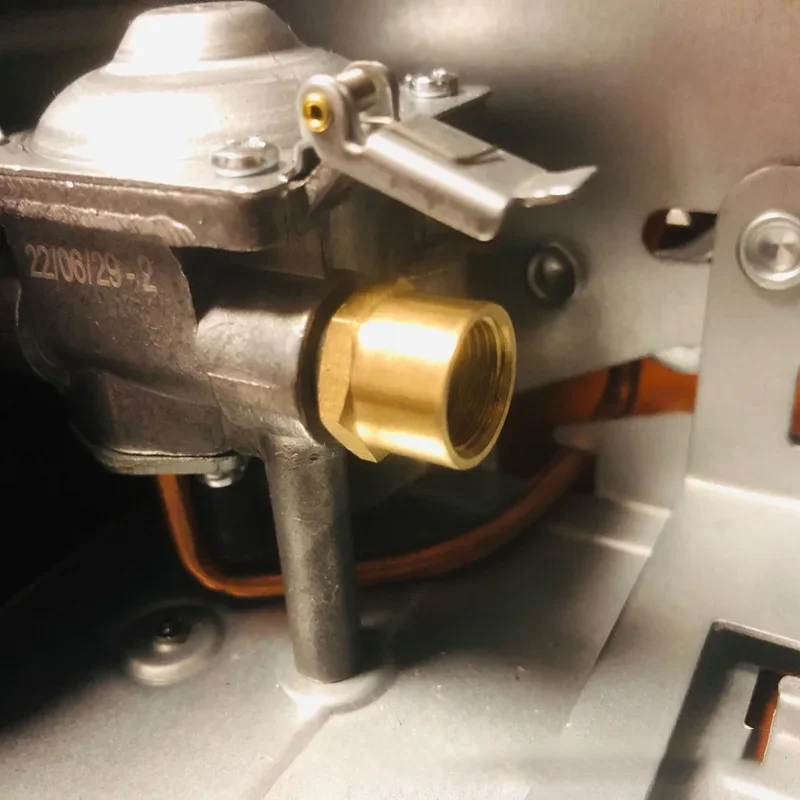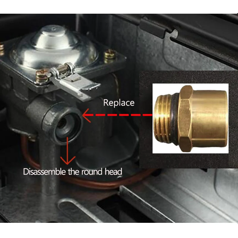 Desparafuse o conector redondo na interface do fogão a gás portátil. Você verá um pequeno componente de latão dentro. Remova este pequeno componente de latão e a mola e, em seguida, reinstale o componente de latão que você comprou.