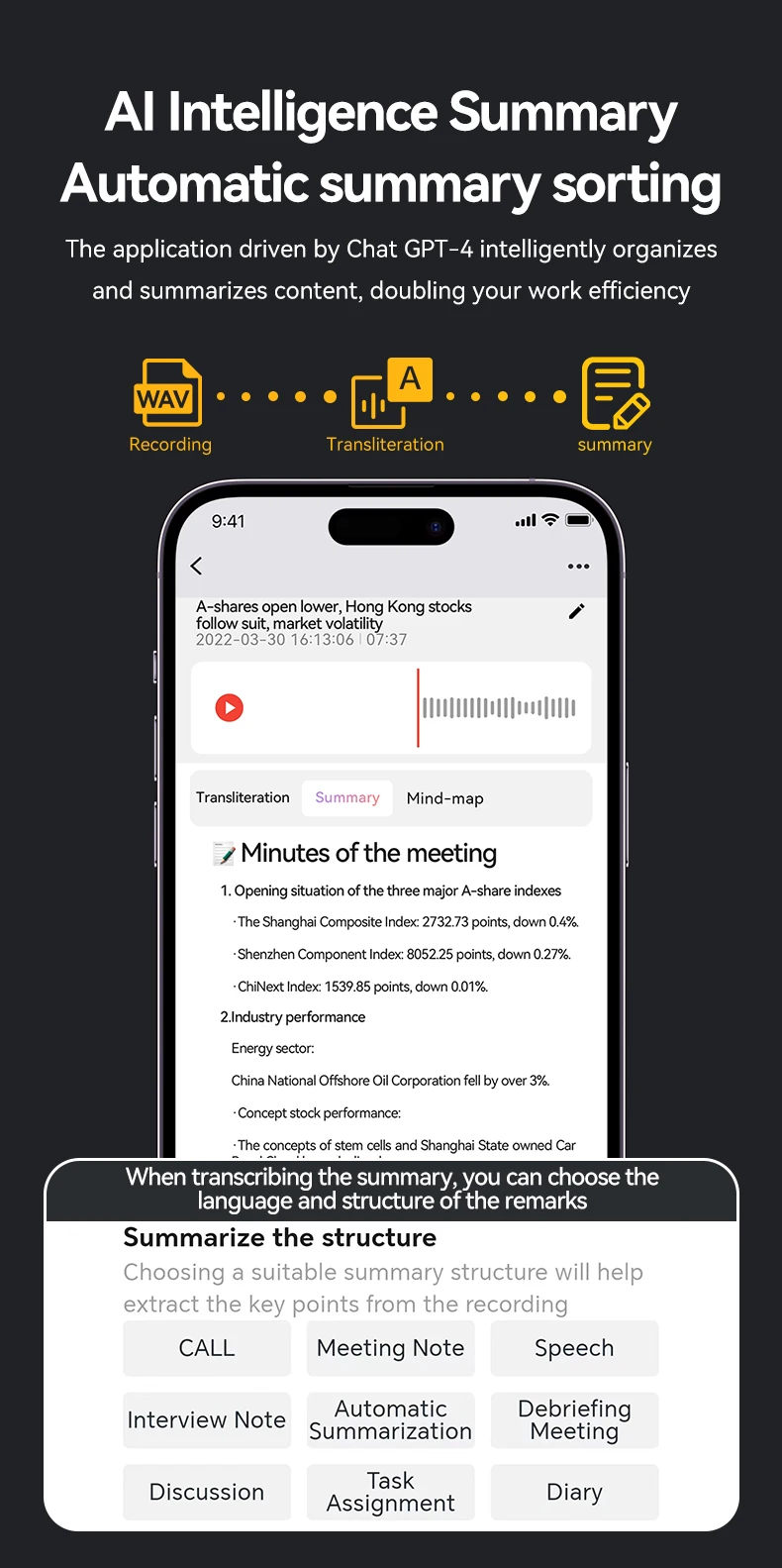 Ai powerd ChatGPT-4 app chamada telefônica mini gravador de voz de áudio espia transcribe summarize 58 tradutor de idiomas ditaphone de áudio