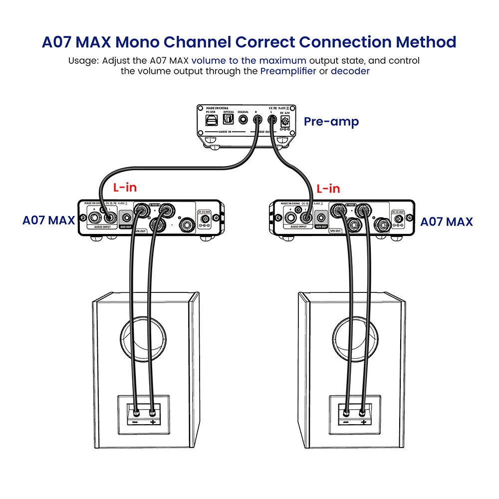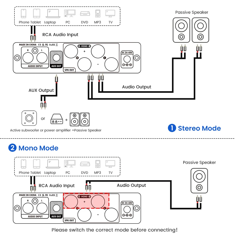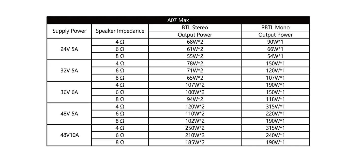 Working Voltage:DC 24-48VPower Supply: 32V/5A, 36V/6A ,48V5A,48V 10A (R+ connect to speaker +, L+ connect to speaker -)