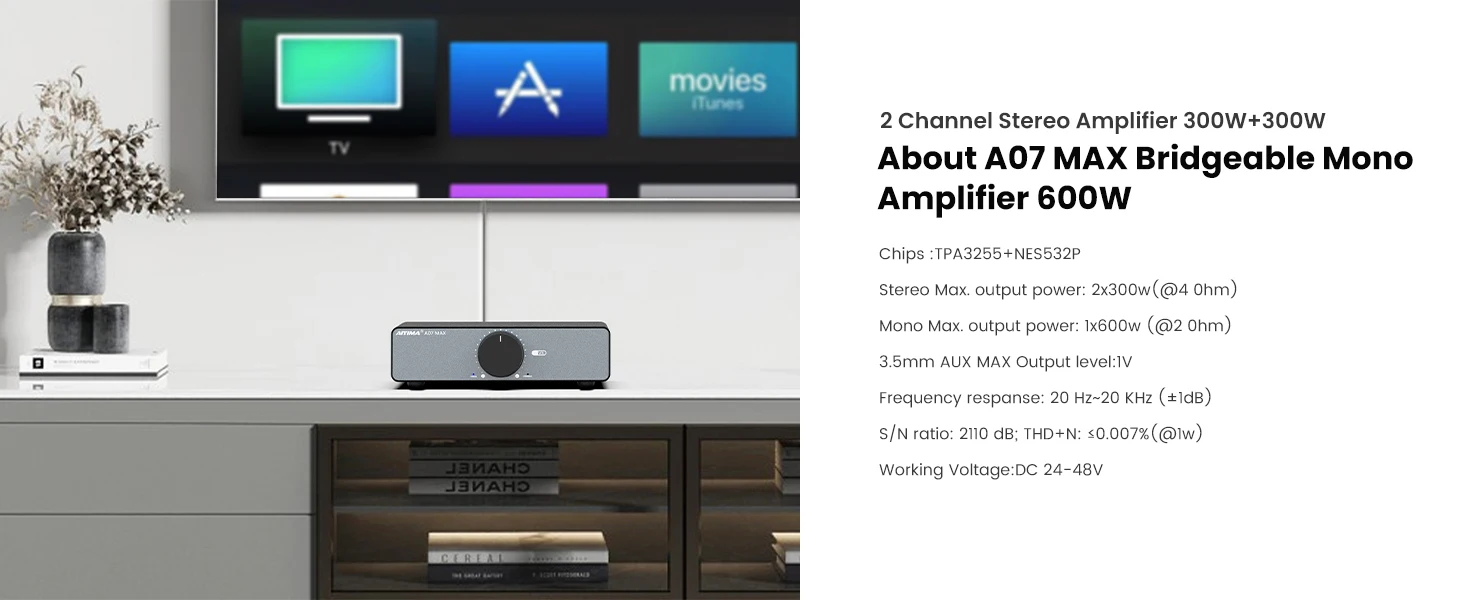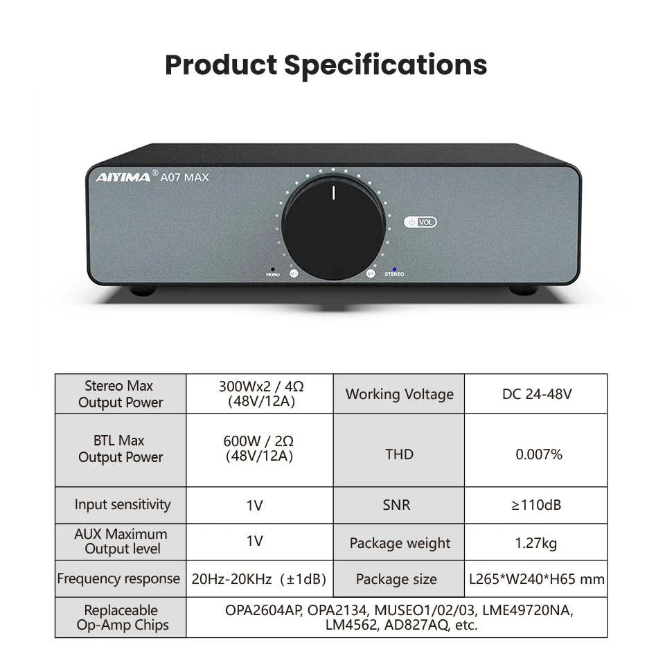- > Aiyima a07 max amplificador de áudio em casa 300w x2 tpa3255 classe d potência alto-falante amp 2 canais ponteable mono 600 w amplificador estéreo