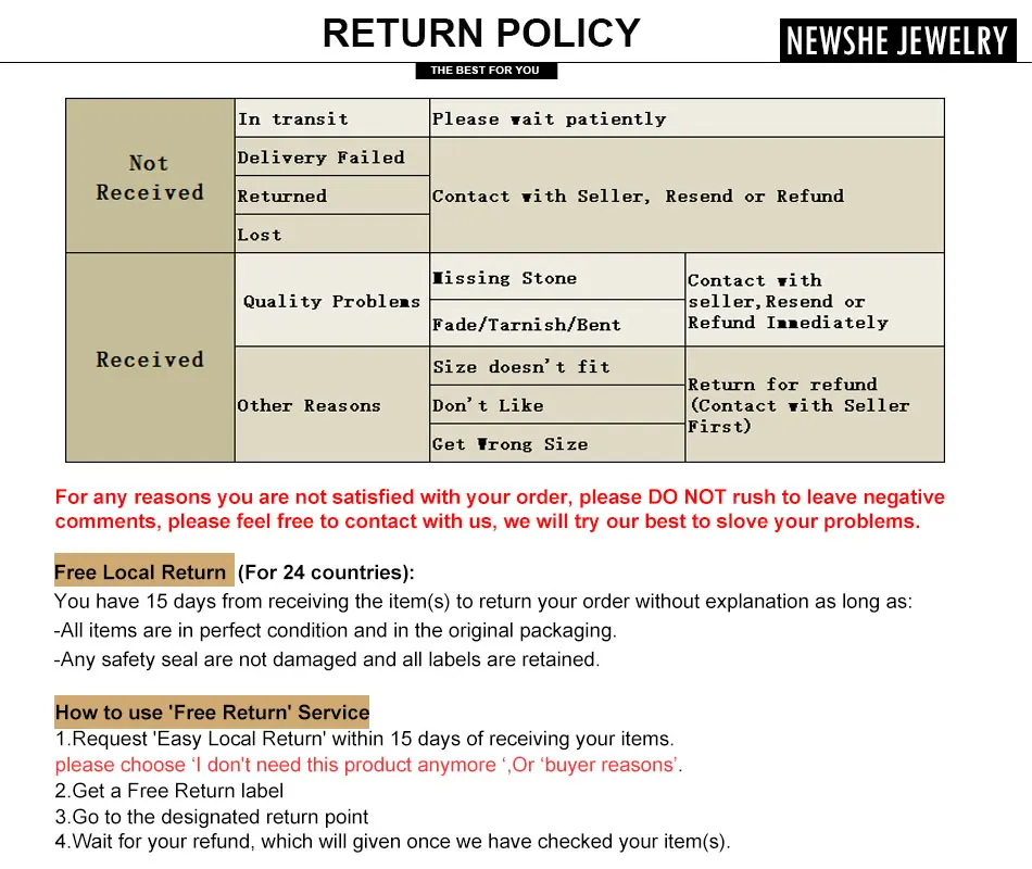 Se o tamanho não couber, entre em contato com o vendedor para obter ajuda e não se apresse em iniciar uma disputa ou dar feedback negativo.