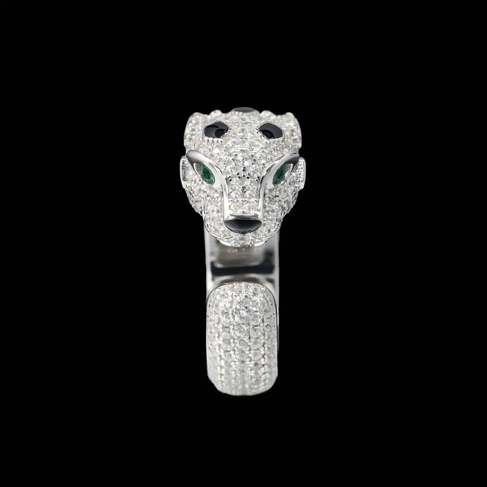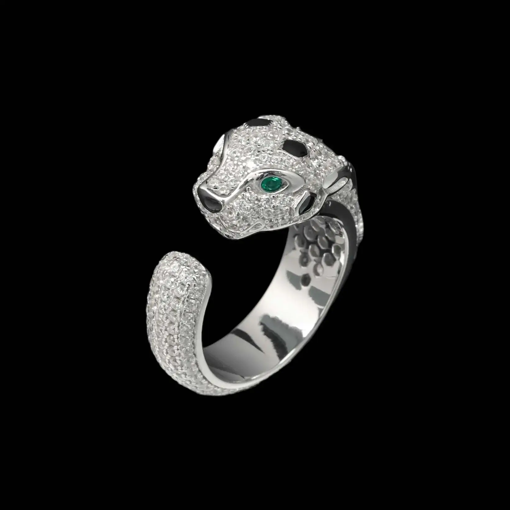 Anel Aberto Luxuoso Pantera com Esmeralda Artificial em Prata Esterlina 925 – Joia Fina de Destaque com Tema Animal para Presentes Femininos em Coquetéis e Banquetes