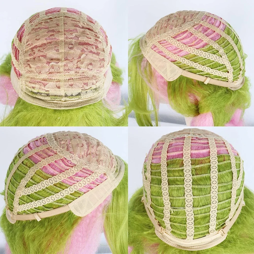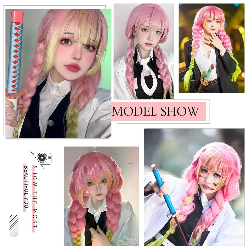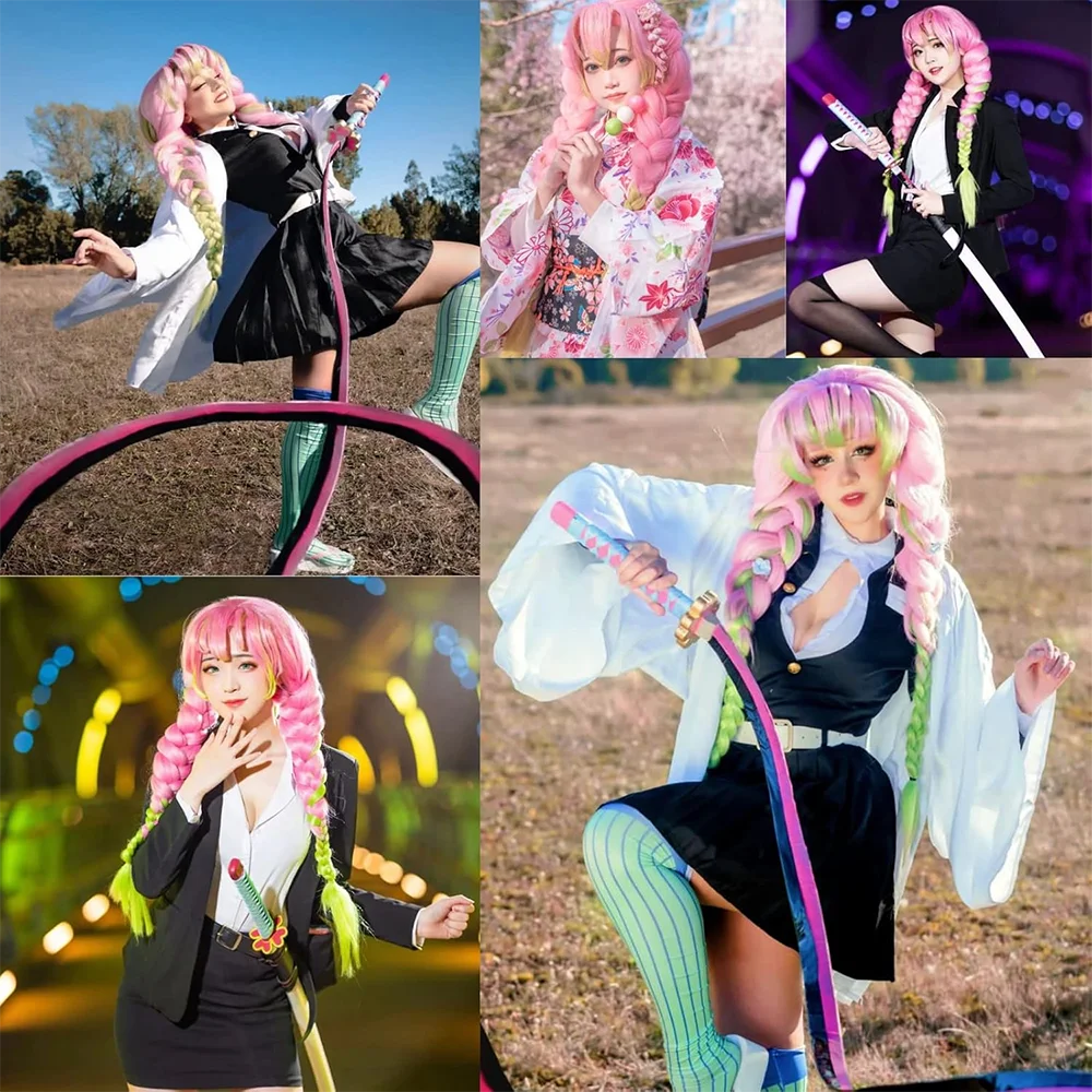 - > Anime Mitsuri Kanroji ? Cosplay cabelo sintético com franja 30 Polegada rosa-verde gradiente três fios tranças peruca de festa de halloween