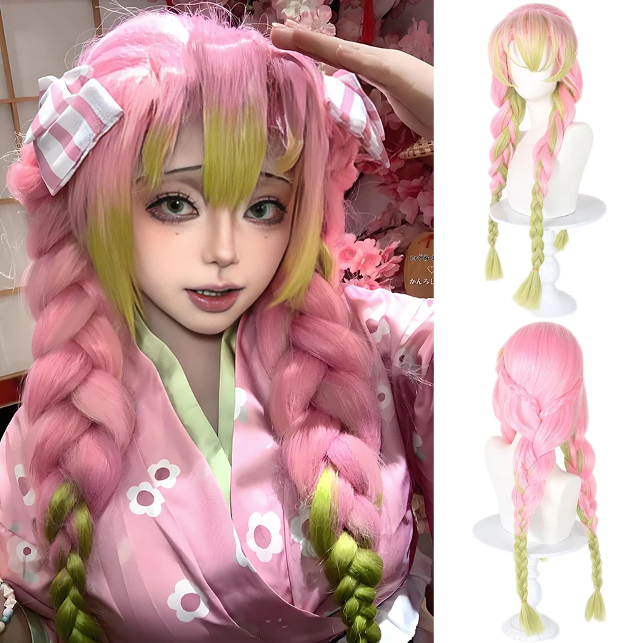 Anime mitsuri kanroji cosplay peruca sintética longa rosa verde trança resistente ao calor cabelo autêntico perucas cosplay
