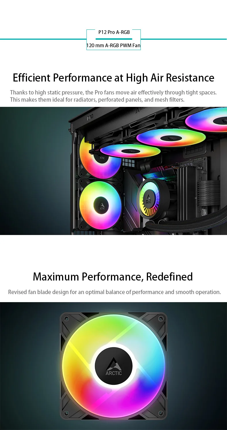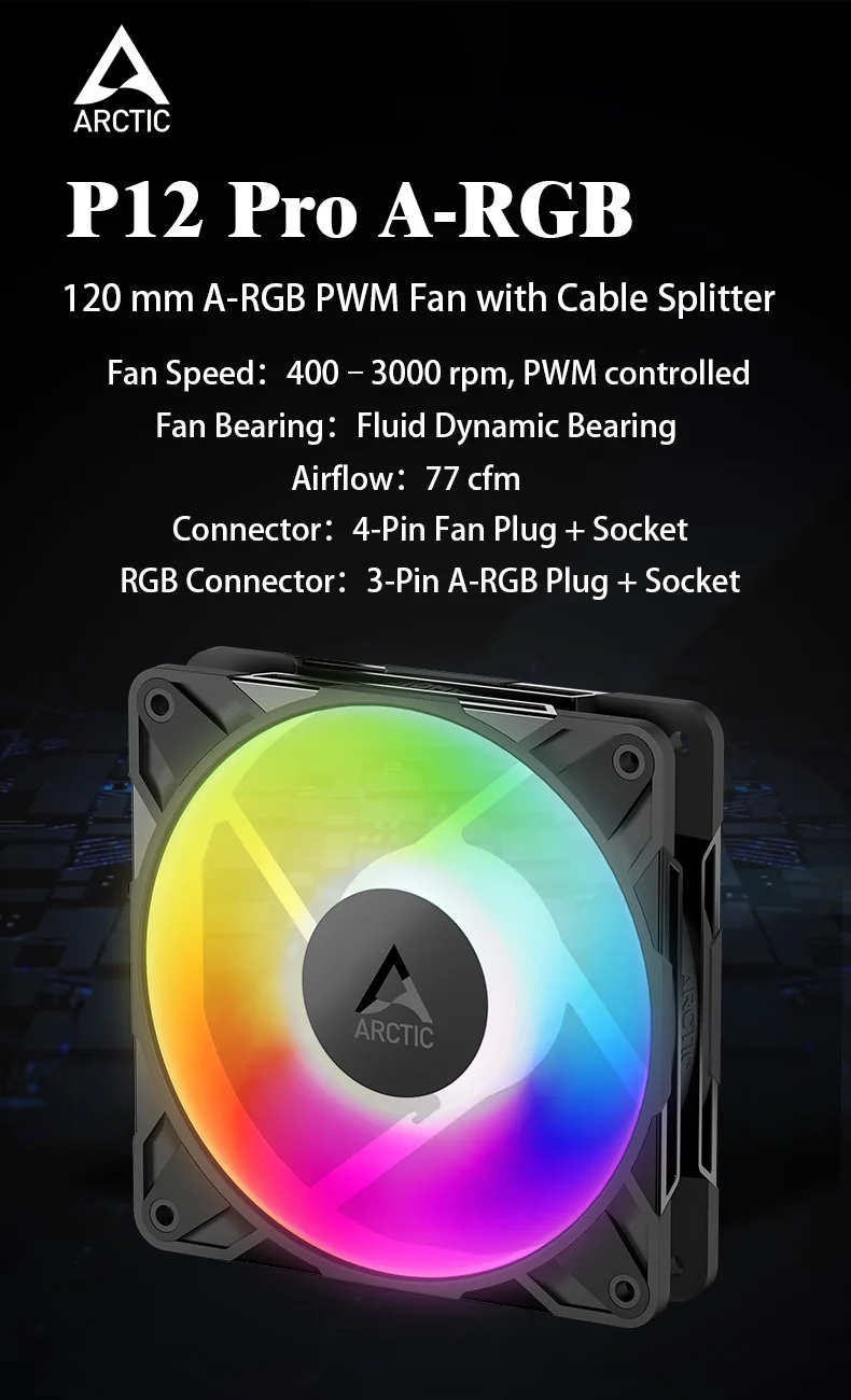 - > ARCTIC P12 Pro A-RGB Ventilador com caixa PWM de 120 mm, otimizado para pressão estática, velocidade do ventilador: 400–3000 RPM, LED A-RGB de 5 V de 3 pinos, ventilador único