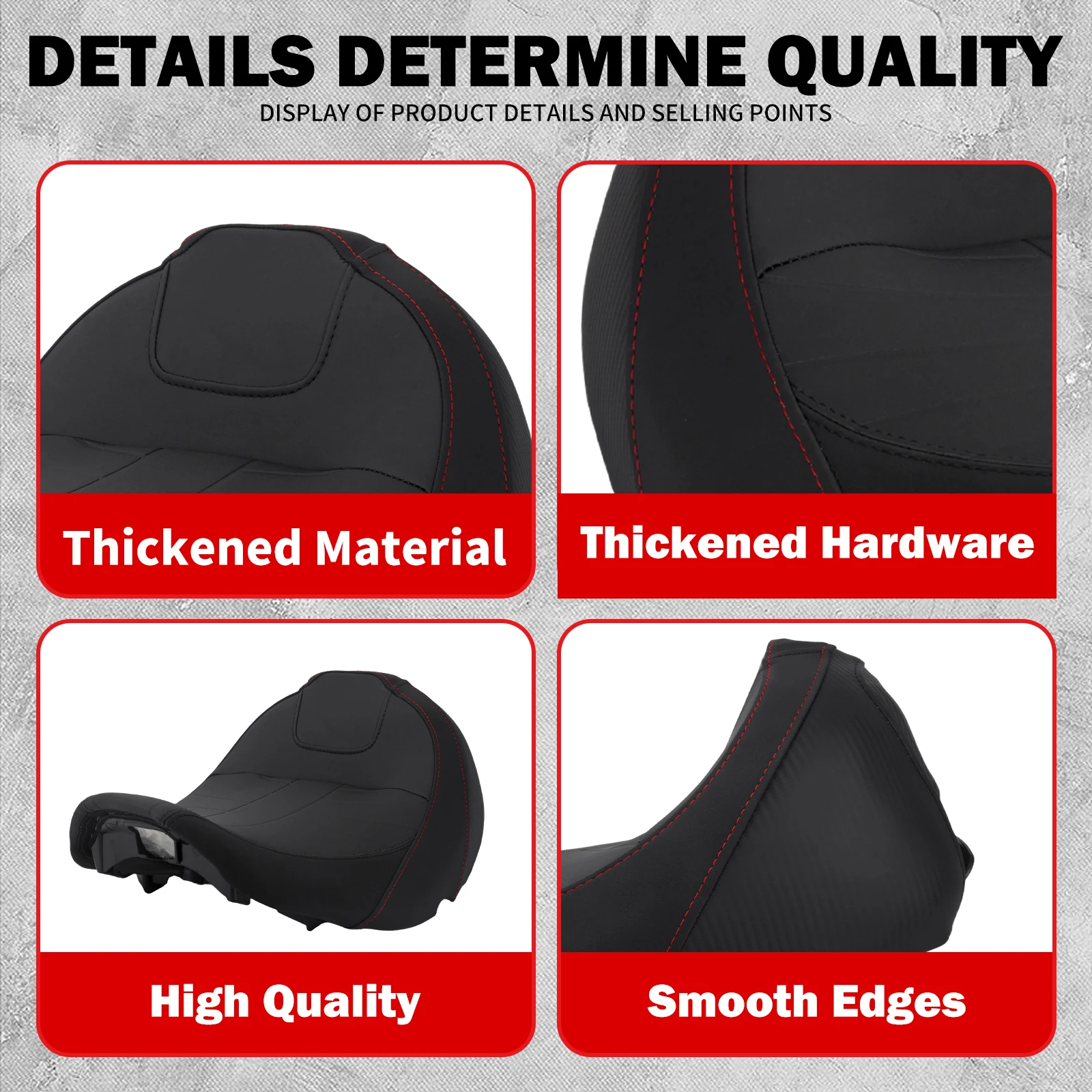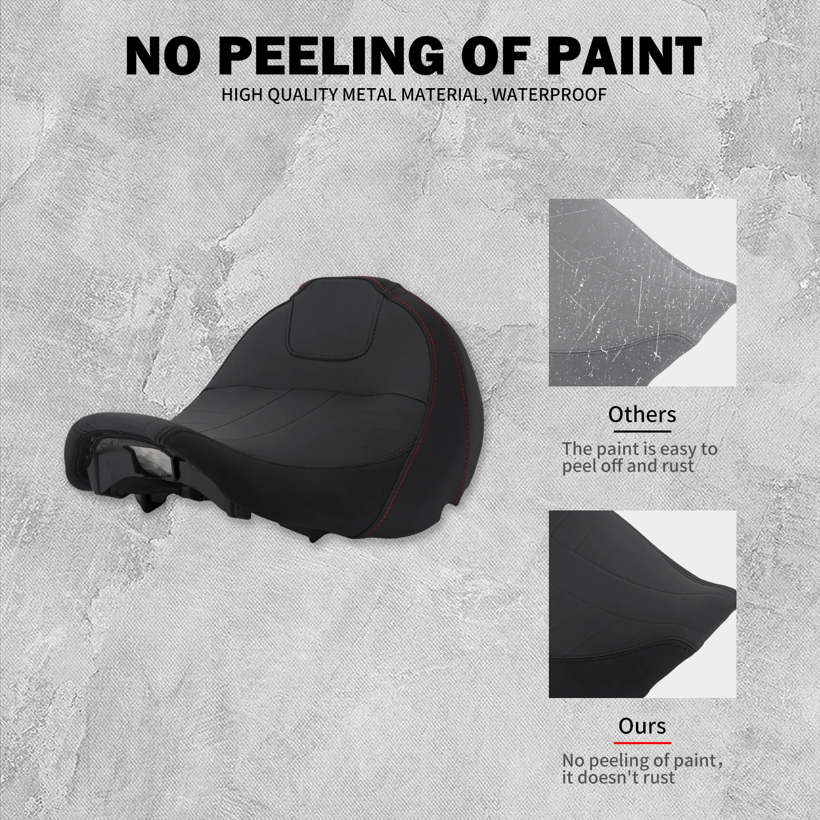 A construção com costuras seladas evita que a chuva ou a água de lavagem se infiltrem na espuma do assento em áreas críticas.