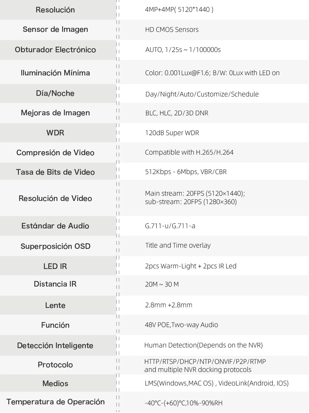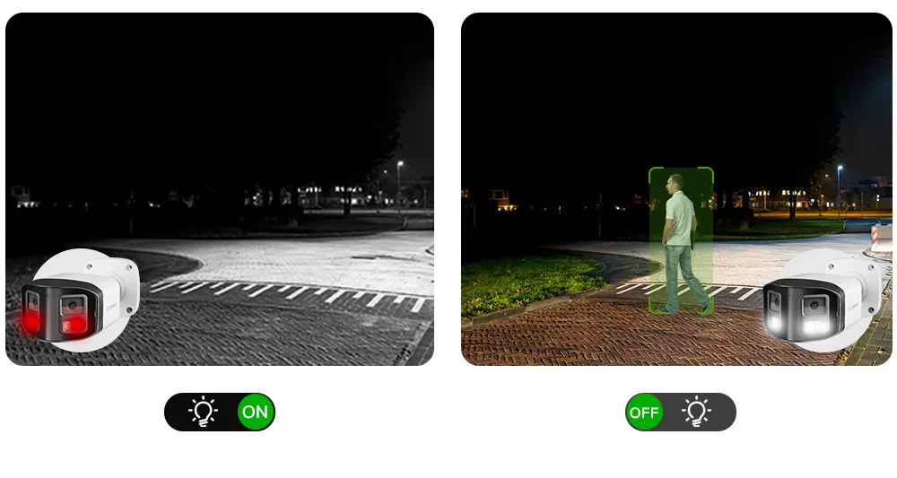 A tecnologia de LEDs IR foi atualizada para fonte de luz dupla.Conjunto de 4 LEDs duplos (2 LEDs de luz quente + 2 LEDs infravermelhos) que exibem uma imagem nítida em preto e branco à noite. No entanto, também pode exibir uma imagem colorida de visão noturna com base na função de IA acionada ou no modo de luz selecionado manualmente.